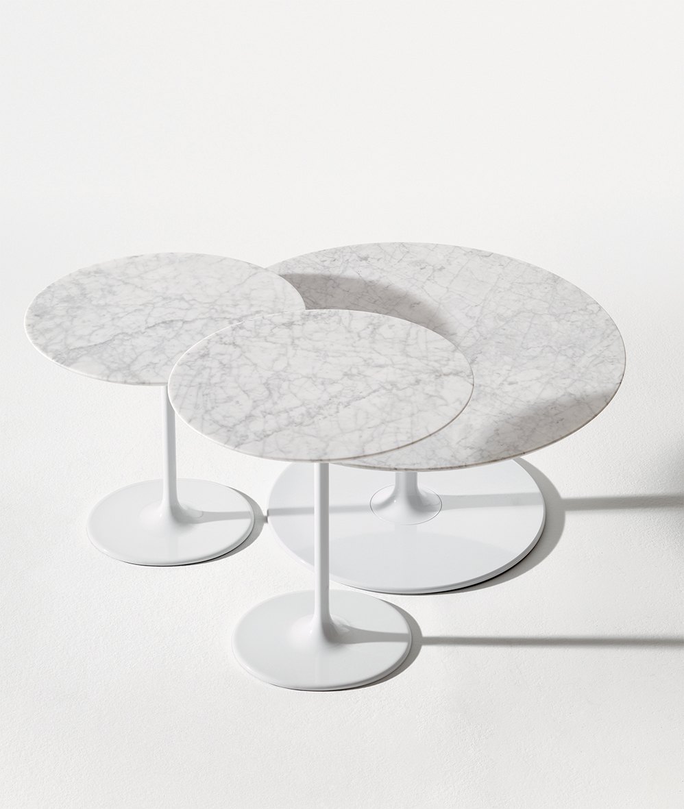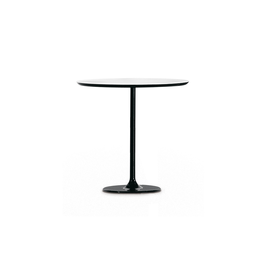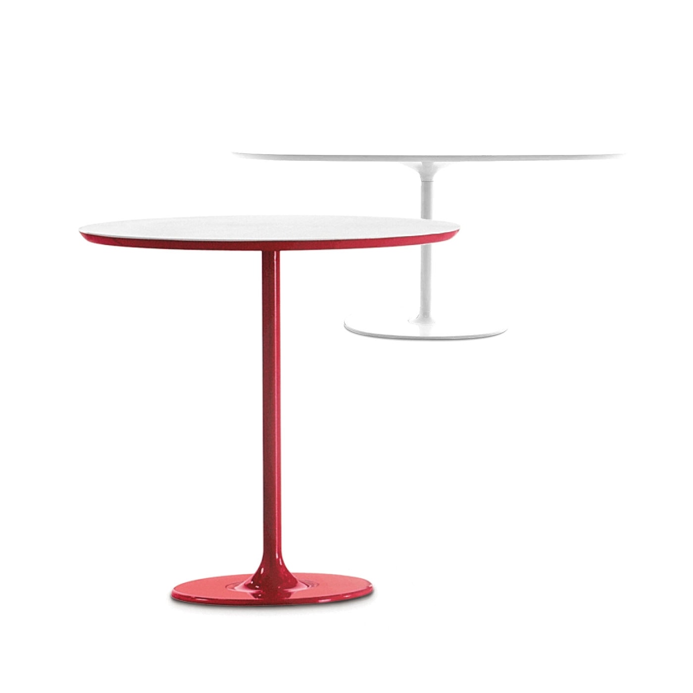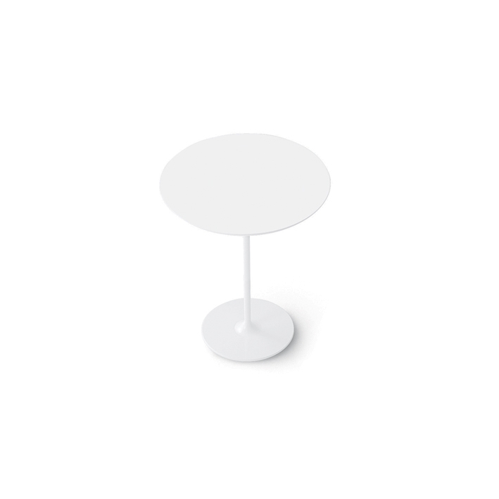 Základny stolů jsou k dispozici v chromové nebo bíle lakované oceli. Bílé desky MDF nebo laminátové desky jsou k dispozici ve velkých, malých, kulatých nebo čtvercových oválech. Verze h 50 s oválnou základnou je k dispozici lakovaná ve čtyřech zářivých barvách - moka, červené, písku a černé.