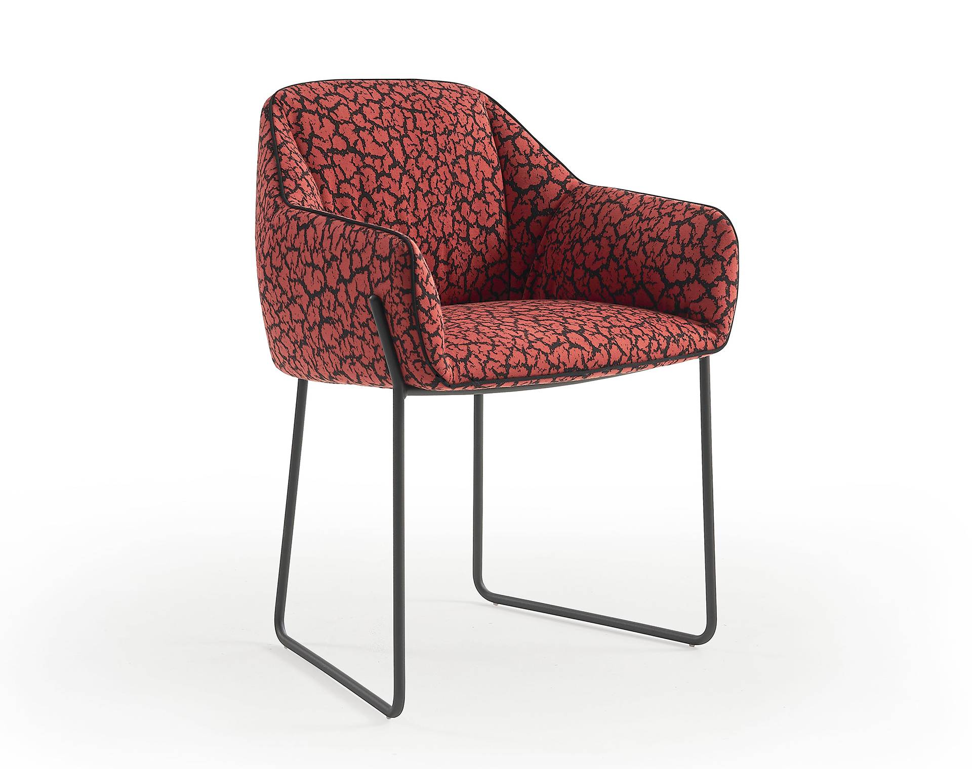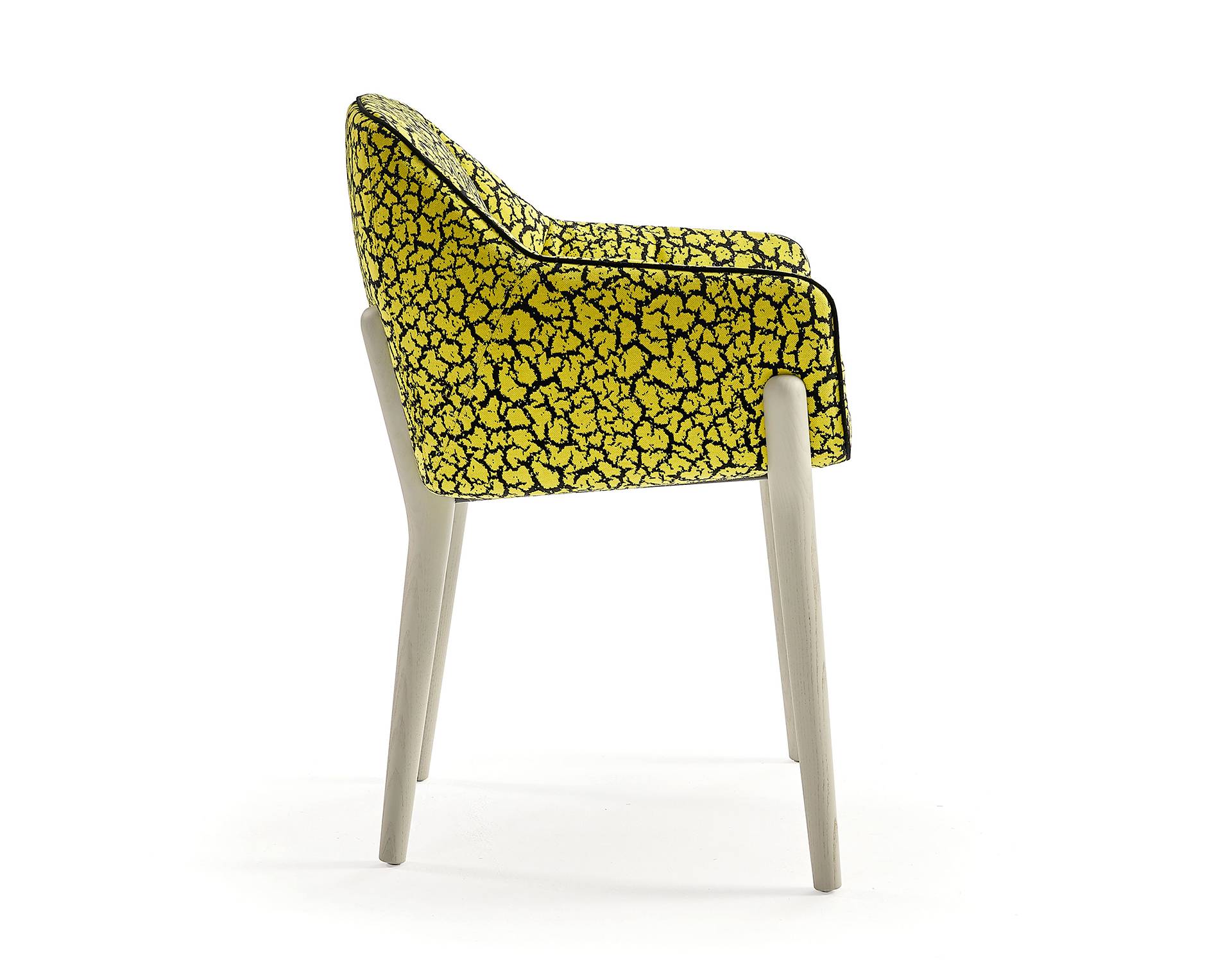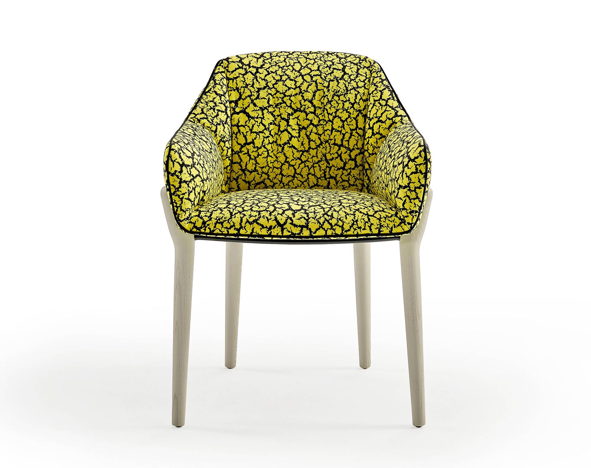 Malé křeslo / židle NIDO, které našlo inspiraci ve tvaru ptačího křídla stojí na ručně upravené dřevěné podnoži z jasanového dřeva nebo na kovovém rámu v matném černém, šedém nebo hnědém provedení. Křesílko dále nabízí možnost vypnuté či nařasené látky na jeho sedáku a opěrce.