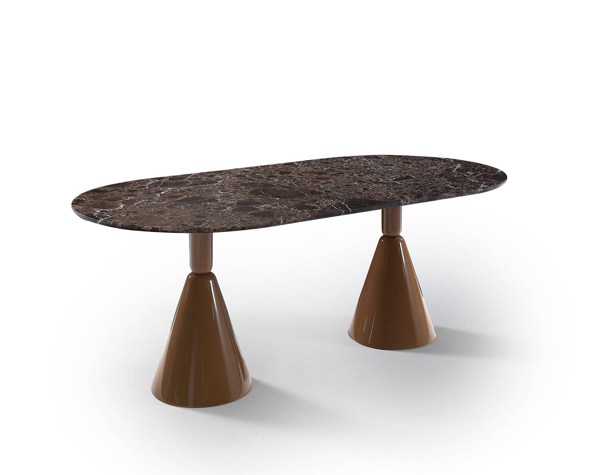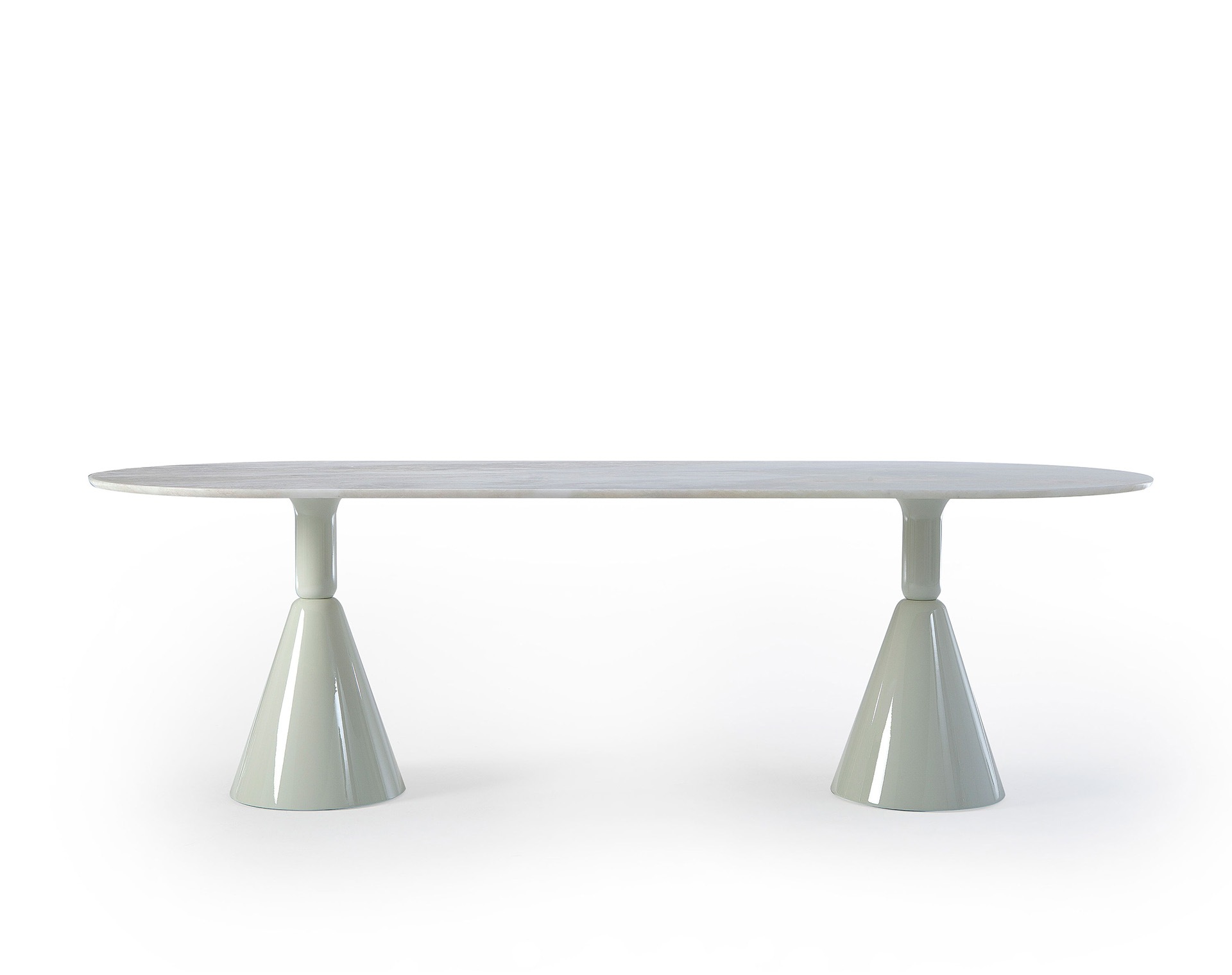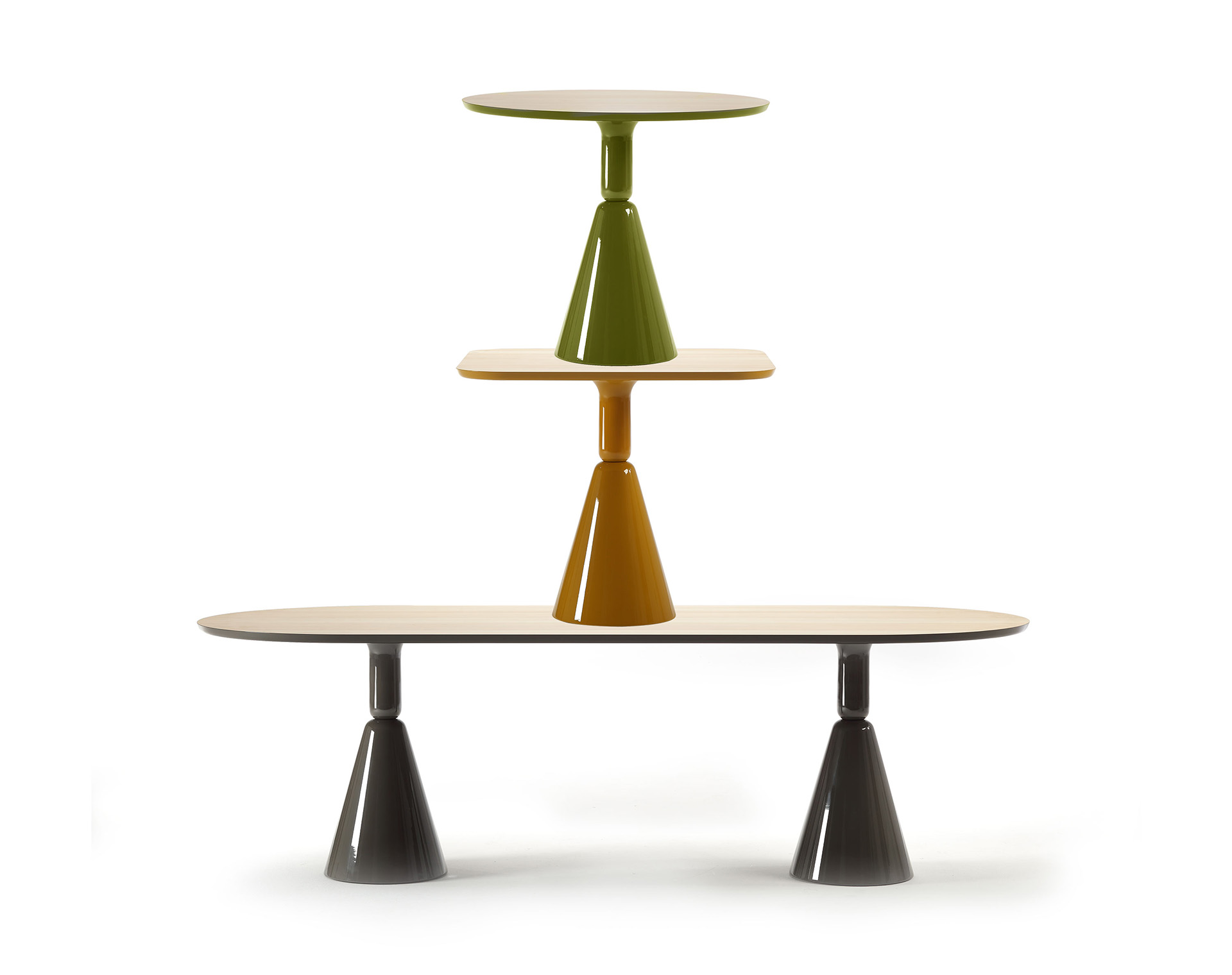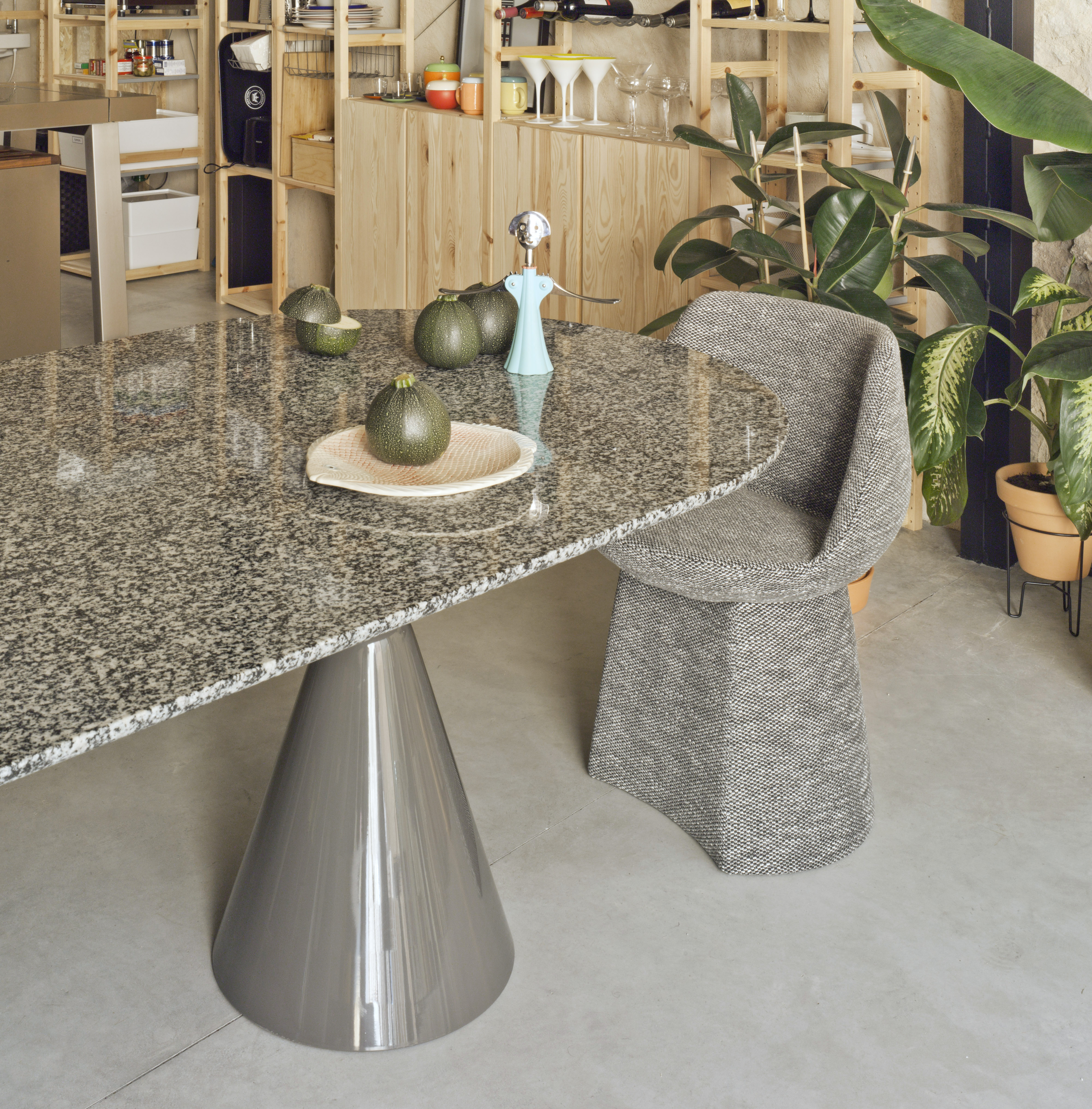 Královská rodina barevných stoliček a stolů inspirována šachovou sadou. Povrchová úprava čítá řadu možností: lakovaný podstavec s vysokým leskem lze kombinovat s přírodním křemencem, mramorem, dřevem nebo kůží.