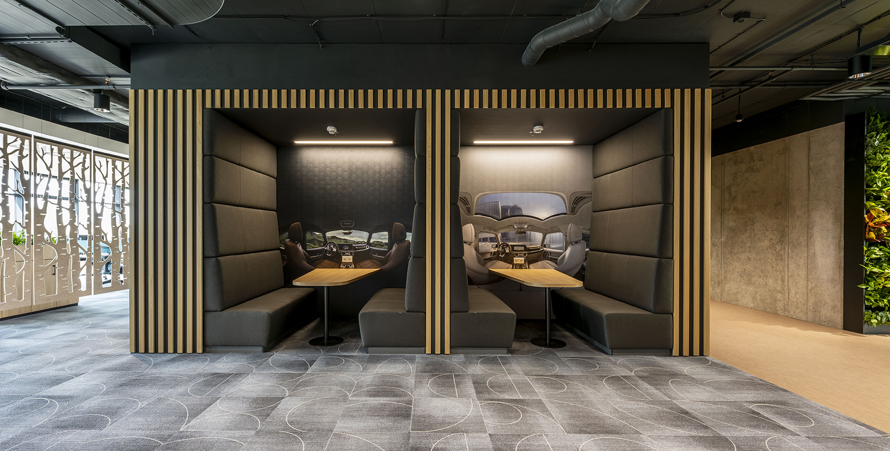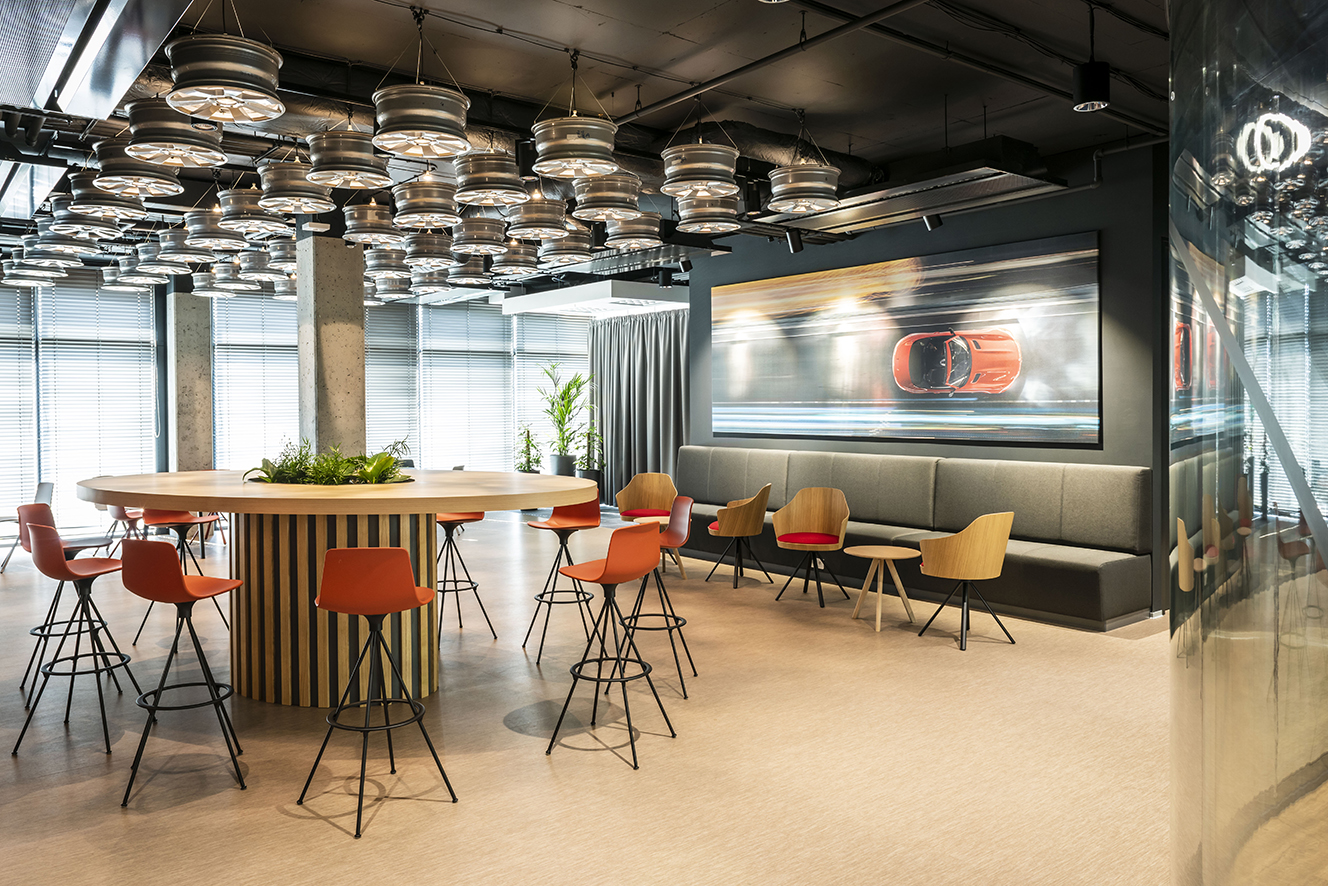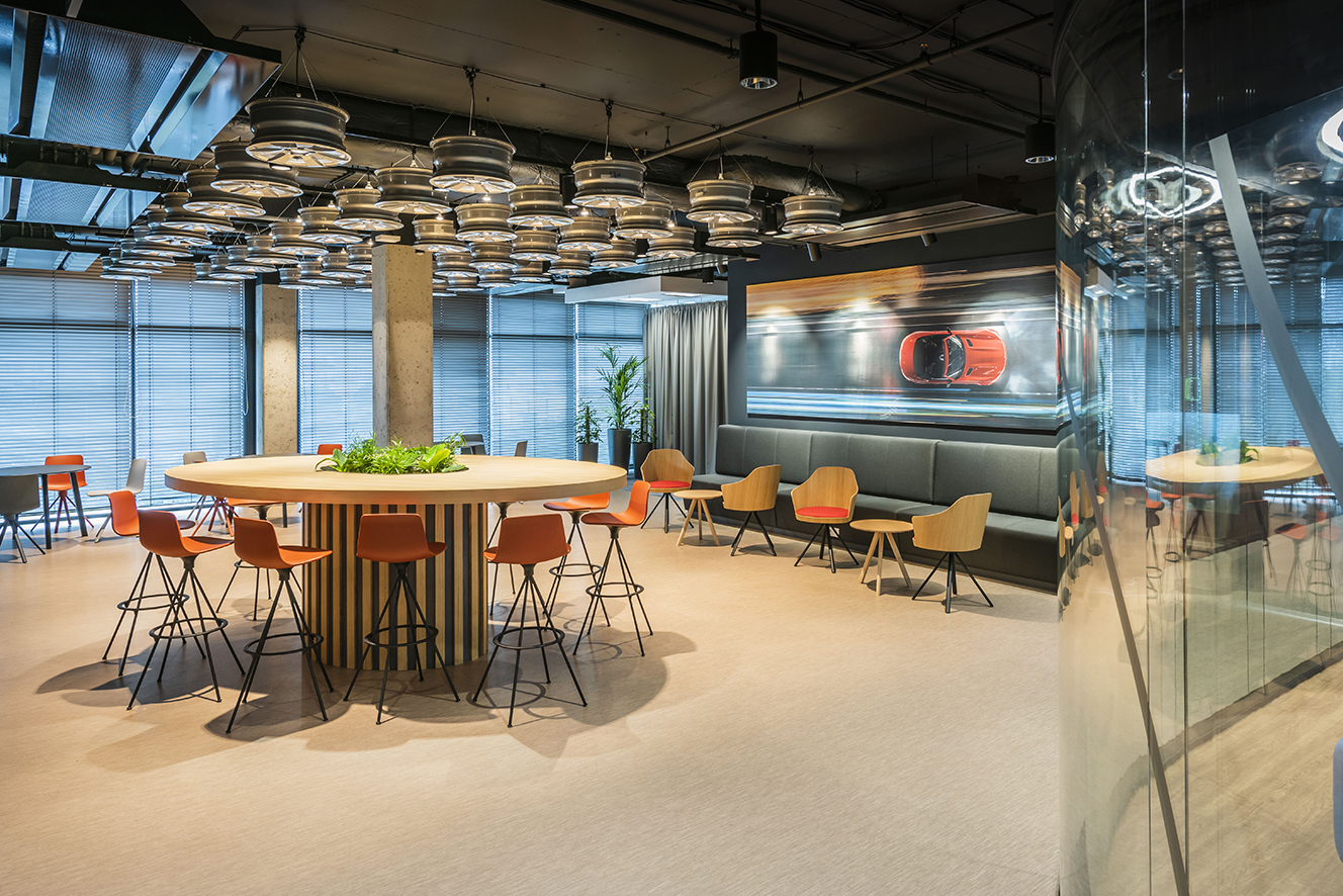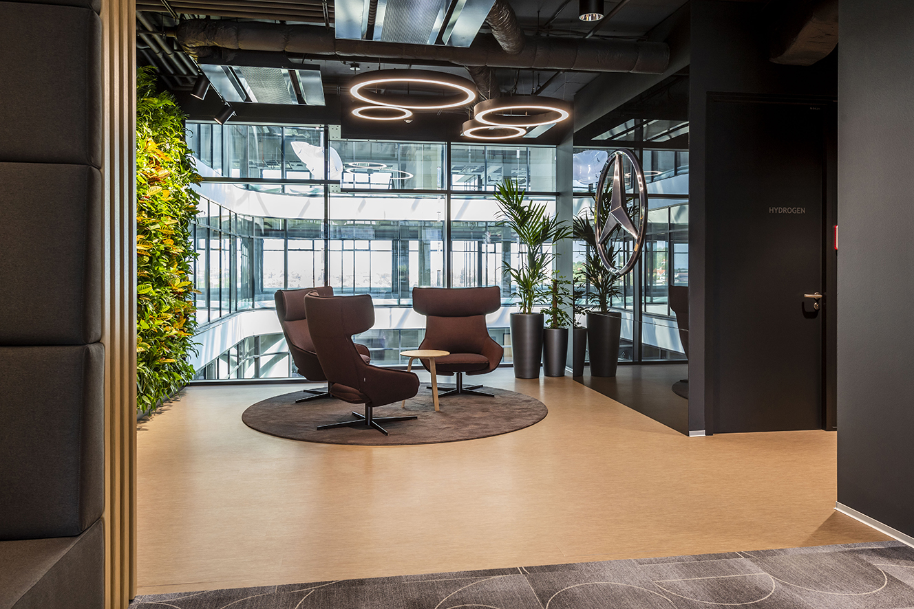 Návrh kanceláře Daimler byl inspirován procesem navrhování automobilů. Chtěli jsme odrážet automobilové tvary a materiály do prostoru a doslova přinést skutečné části produktu společnosti, jako speciální prvek používaný v sociálním centru - zavěšený strop vyrobený z ráfků kol, ale používaný jako svítidla.