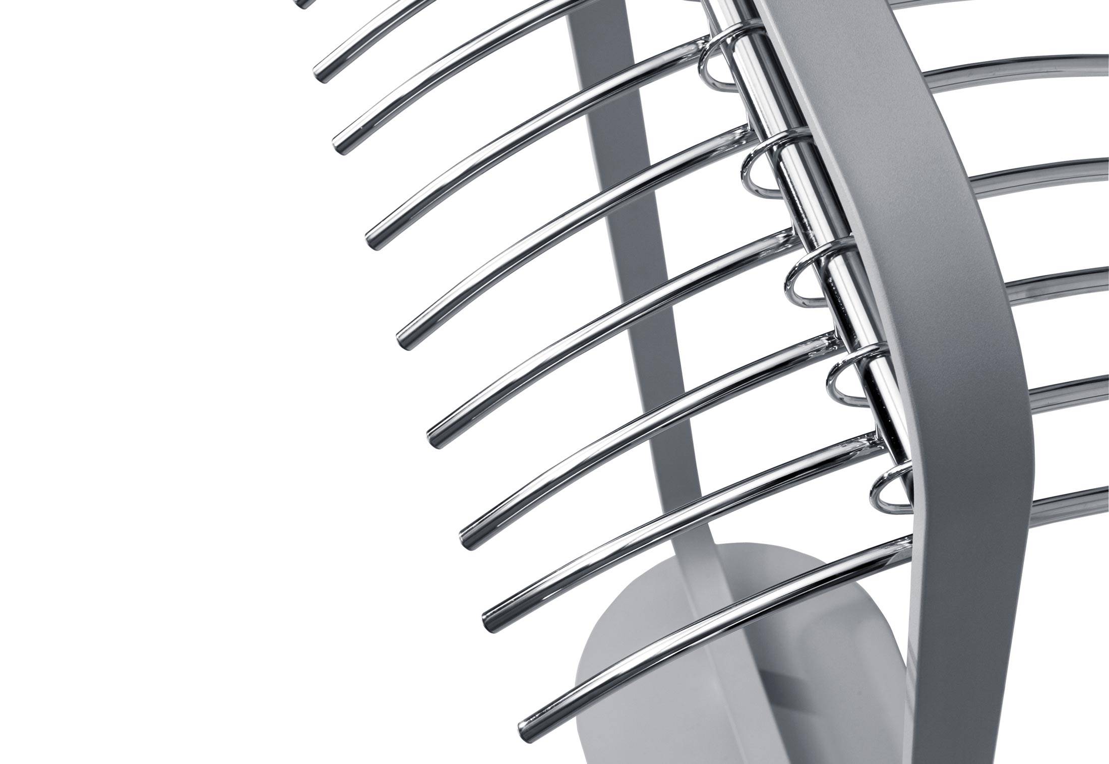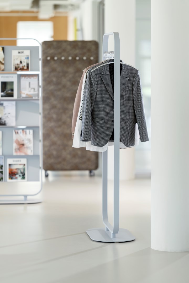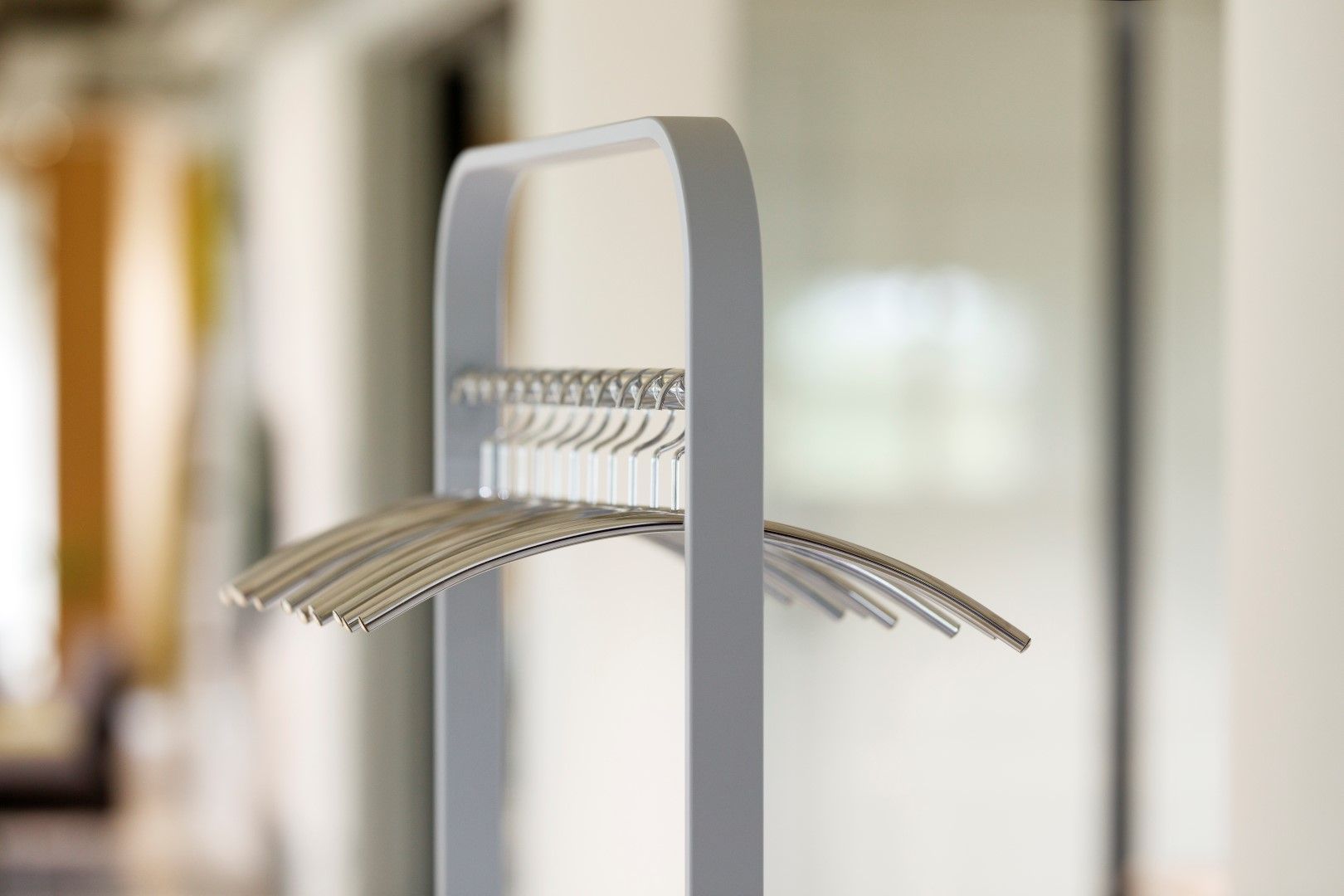 The Focus wardrobe element makes a streamlined, orderly impression in any living or working environment. As the horizontal bar is grooved, the coats hang at regularly spaced intervals. The frame and base of Focus are made of steel. Timeless, high-quality and modern. Available in high-gloss white or silver grey.