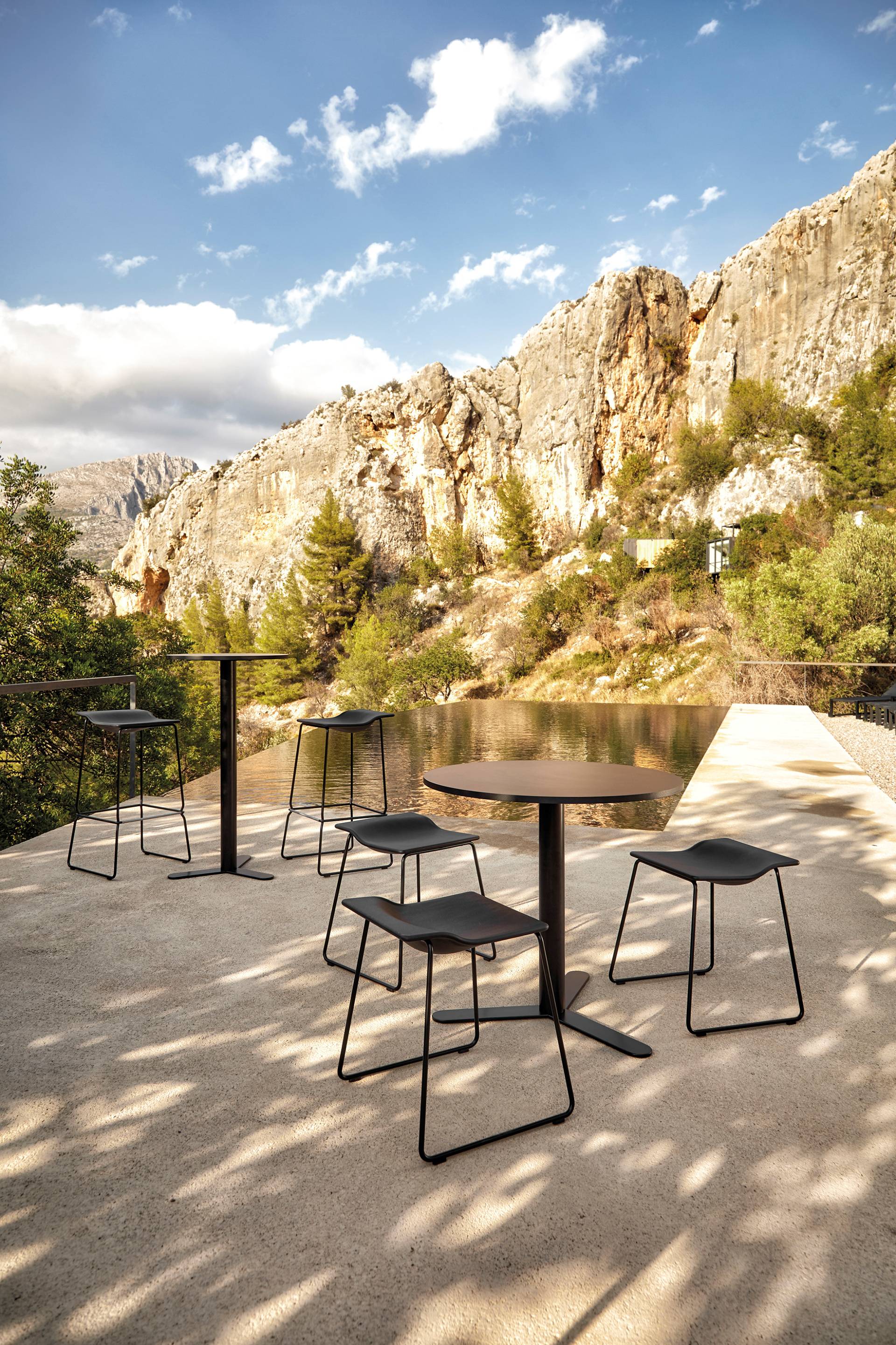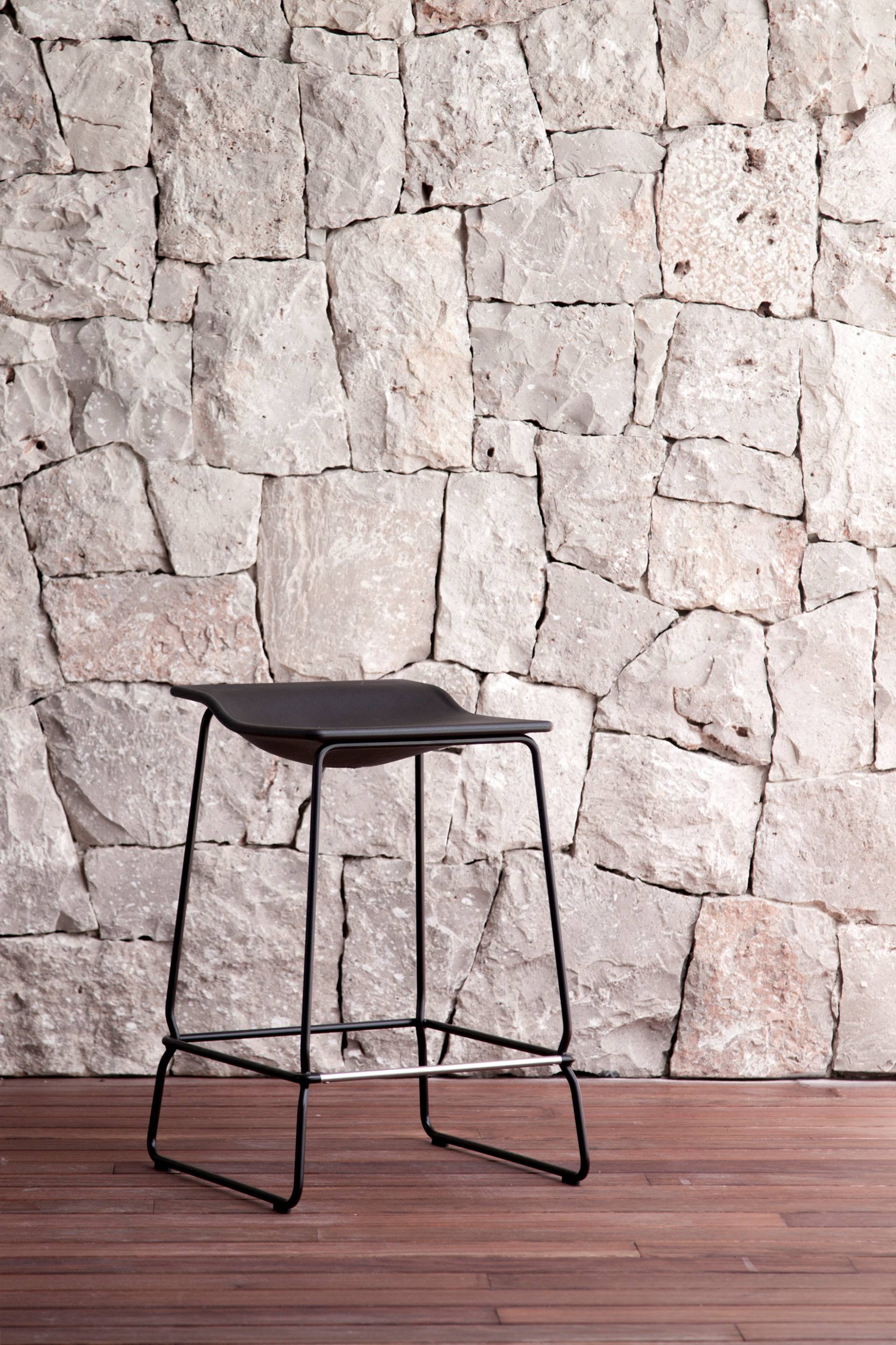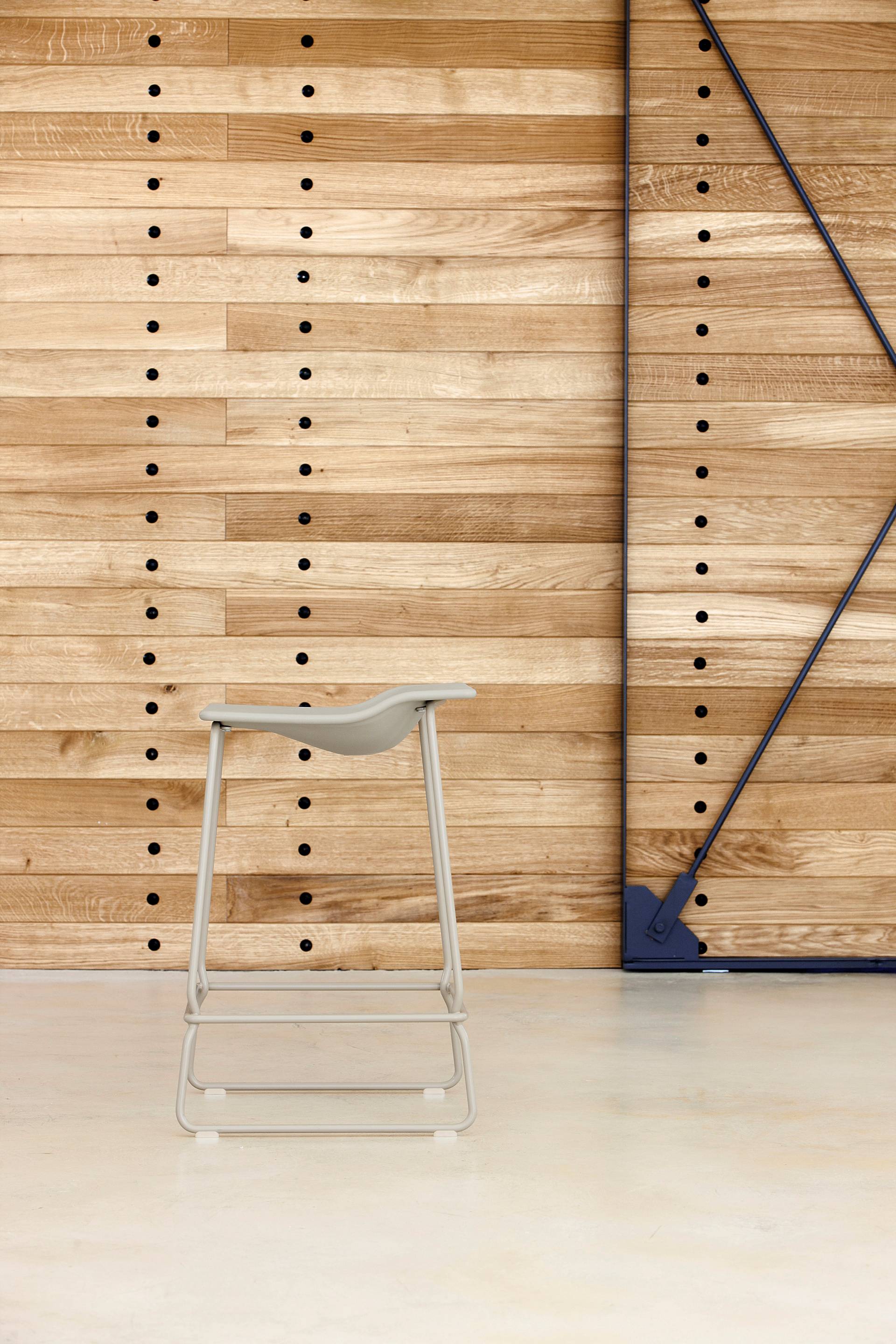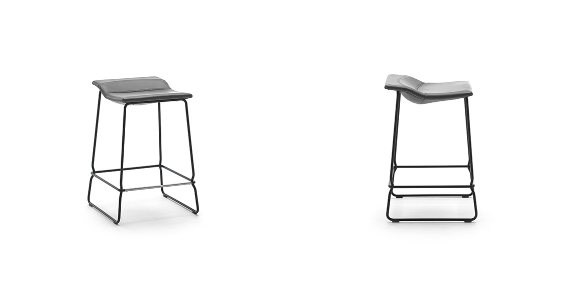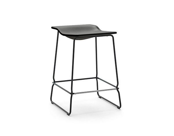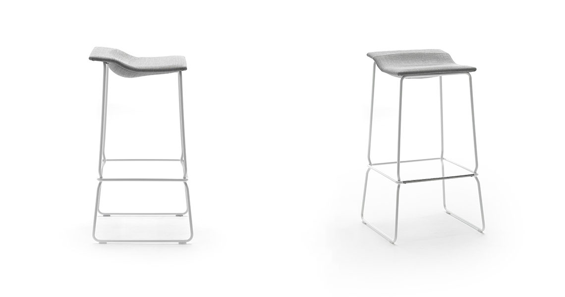 A rotomoulded polyethylene seat with lacquered steel frame and stainless steel footrest it is suitable for interior and exterior. Its structural design has become a contemporary classic. Now available the upholstered seat version.