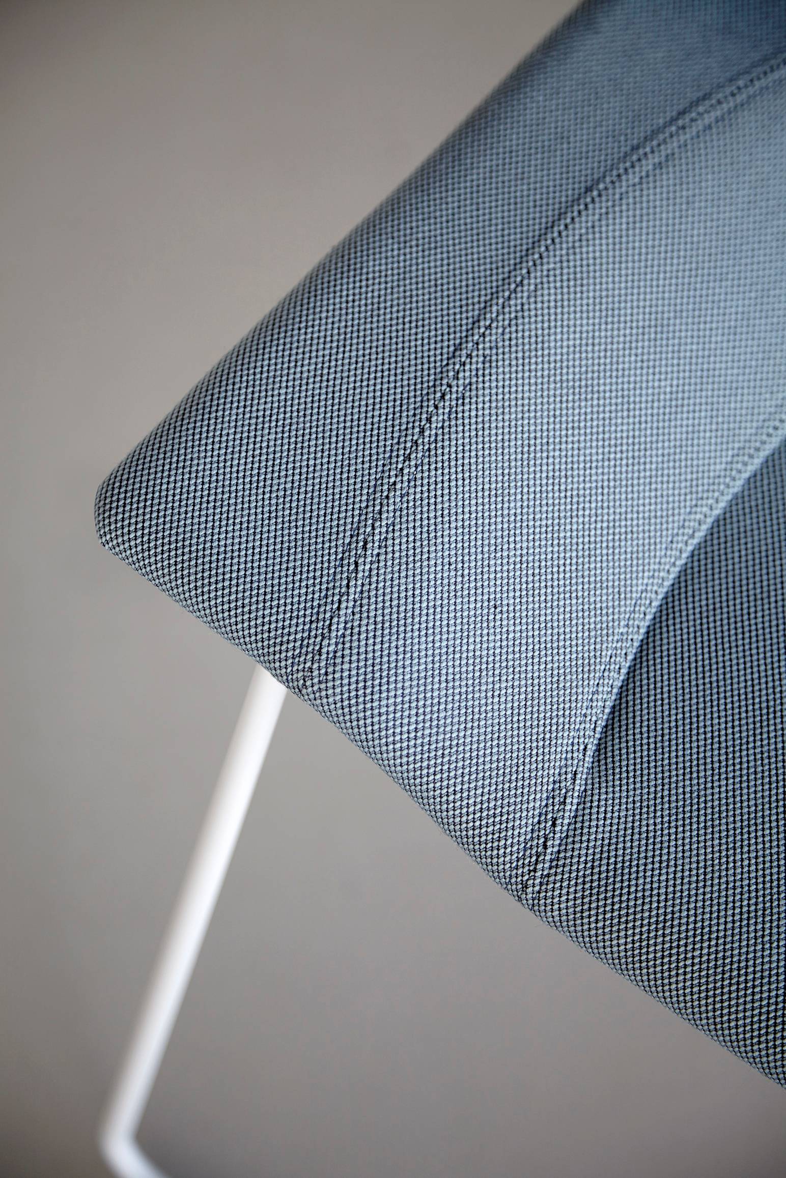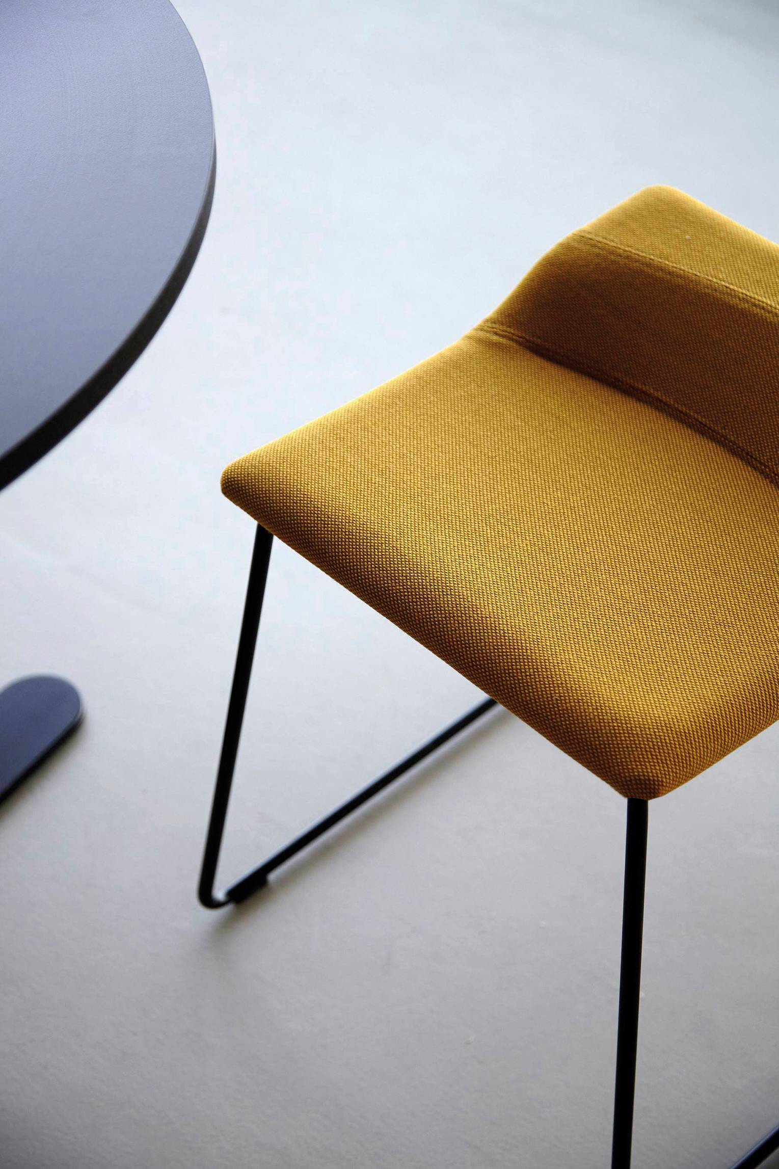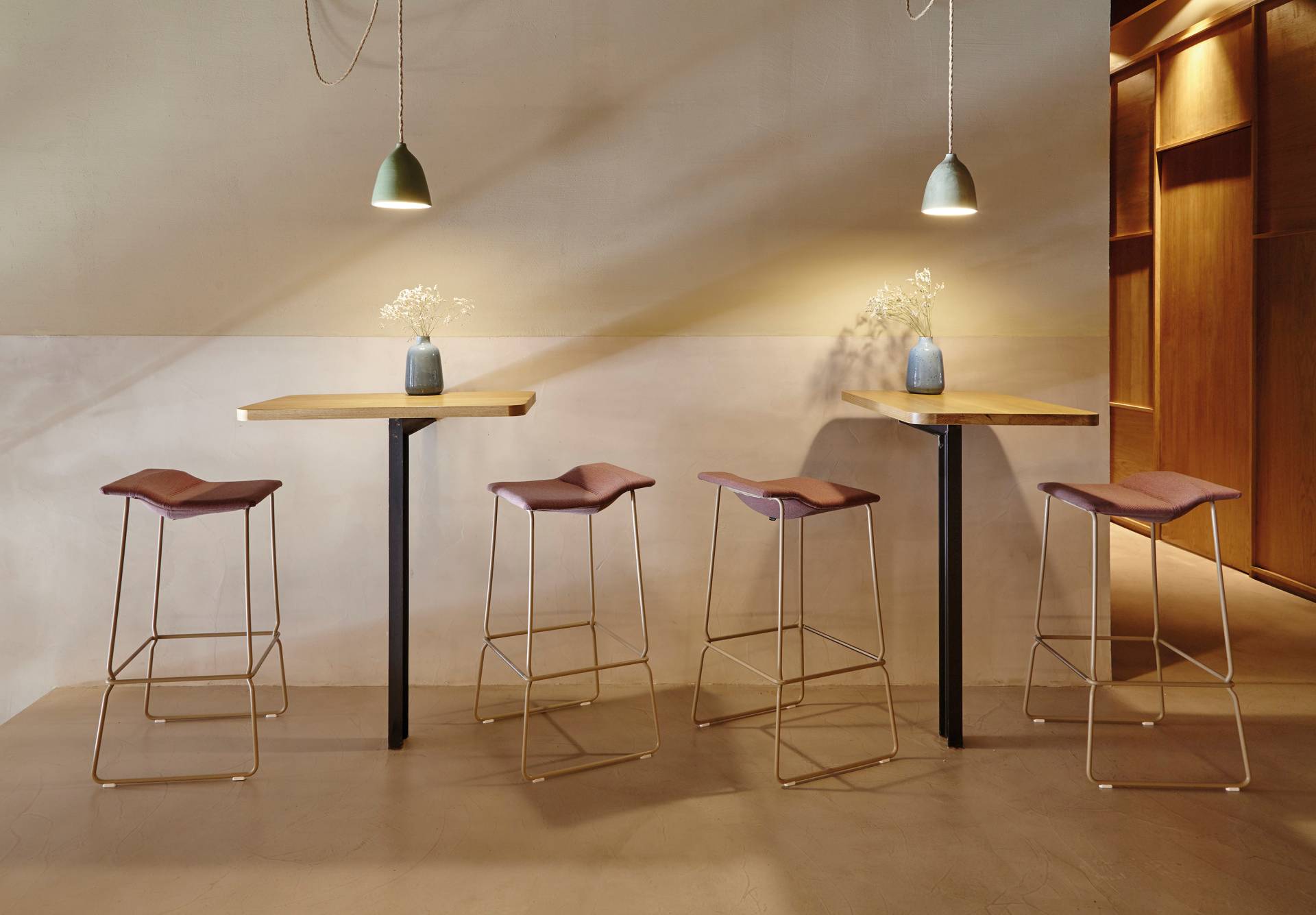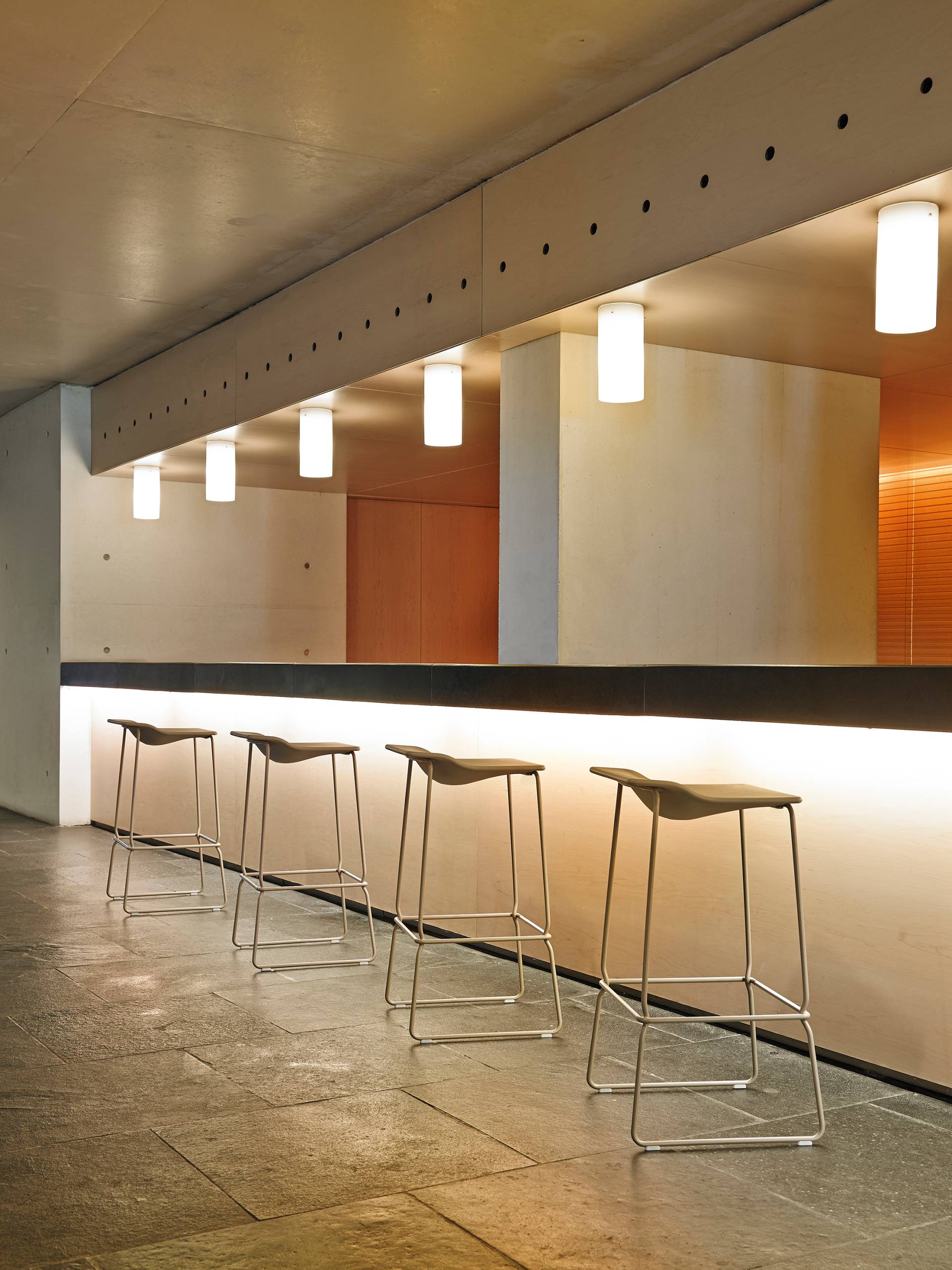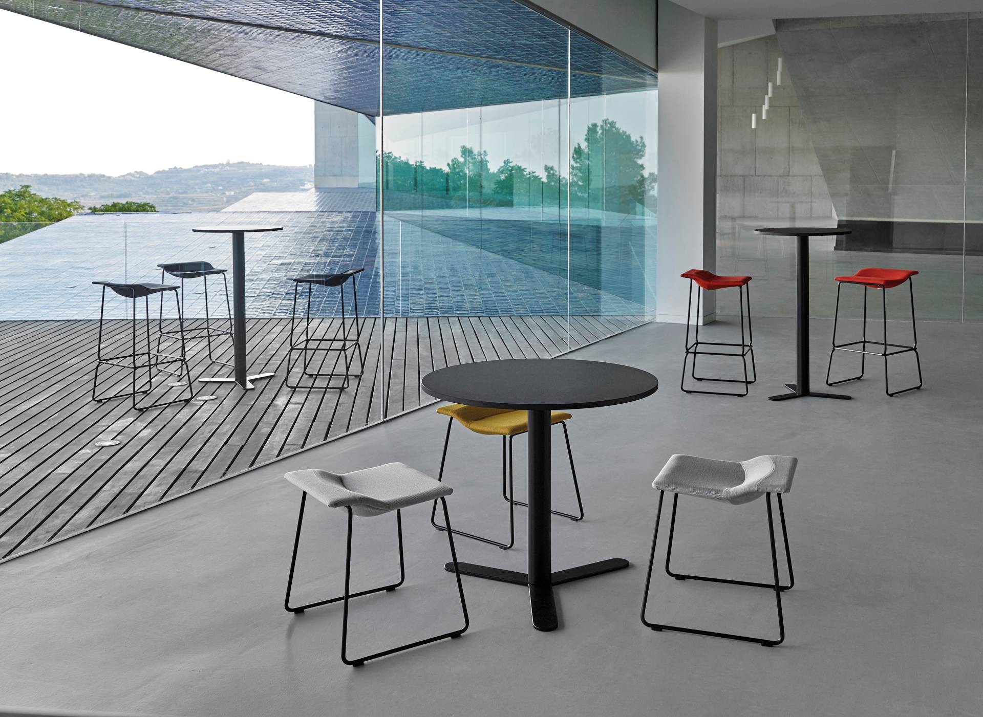 A rotomoulded polyethylene seat with lacquered steel frame and stainless steel footrest it is suitable for interior and exterior. Its structural design has become a contemporary classic. Now available the upholstered seat version.
