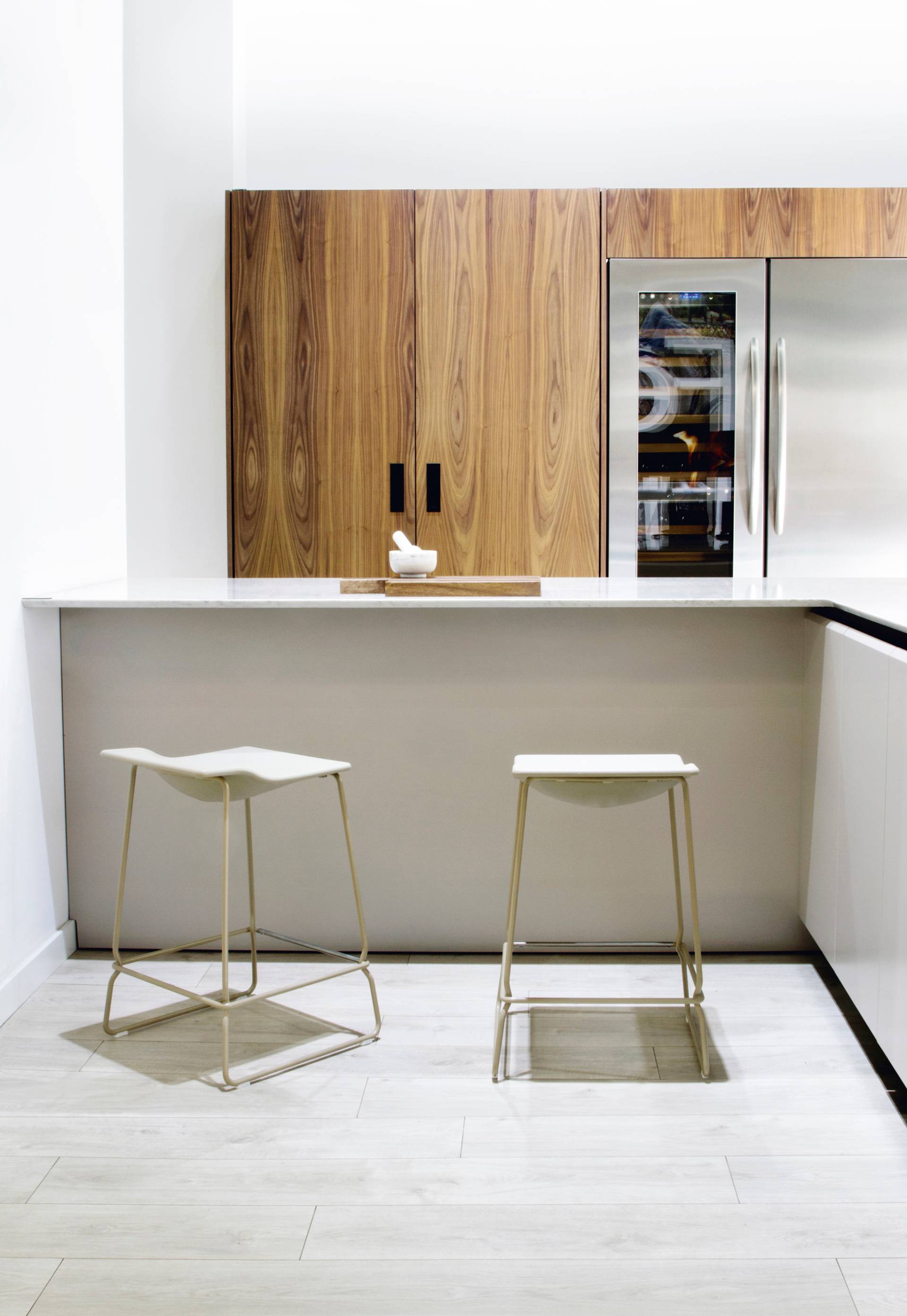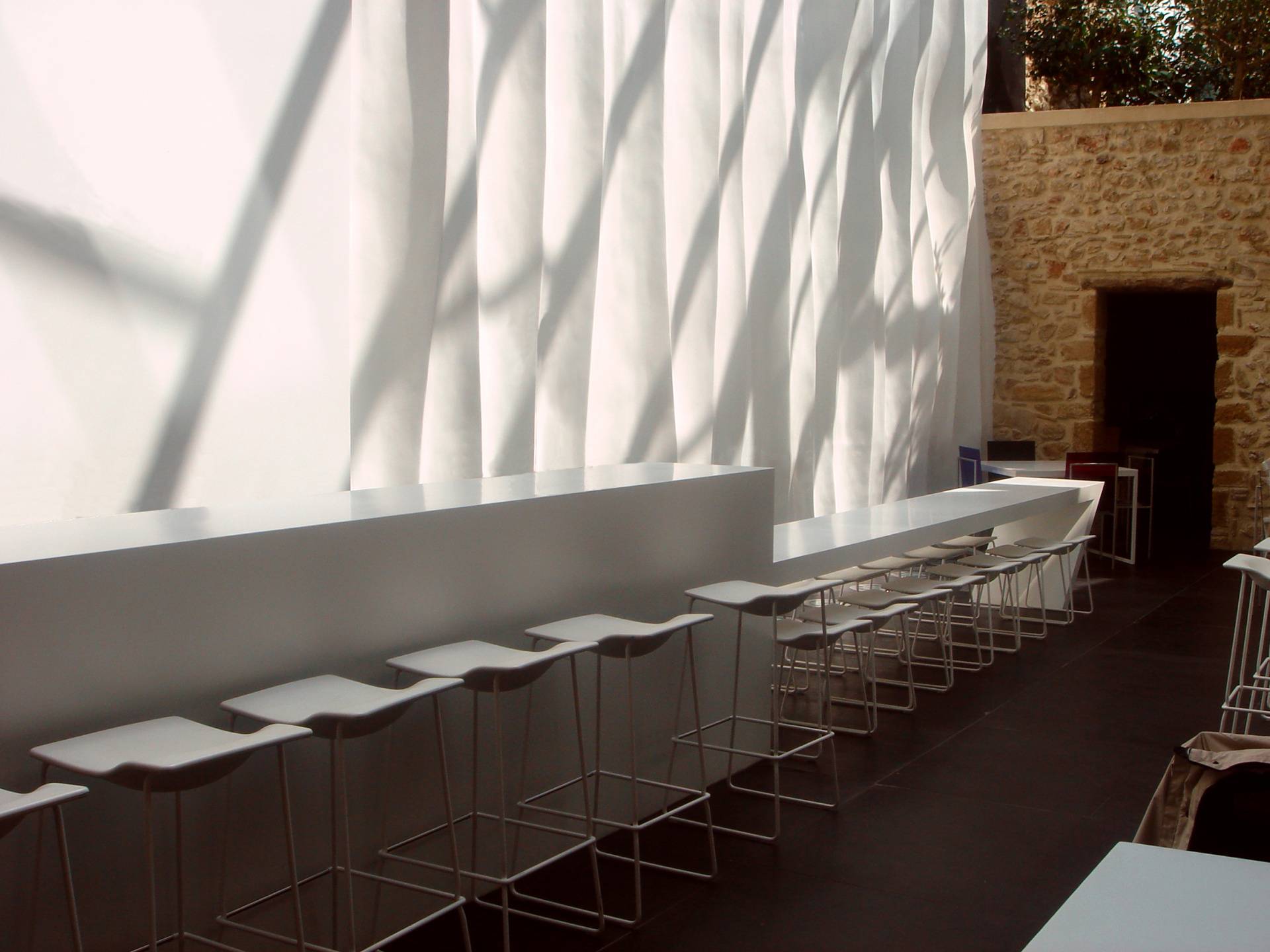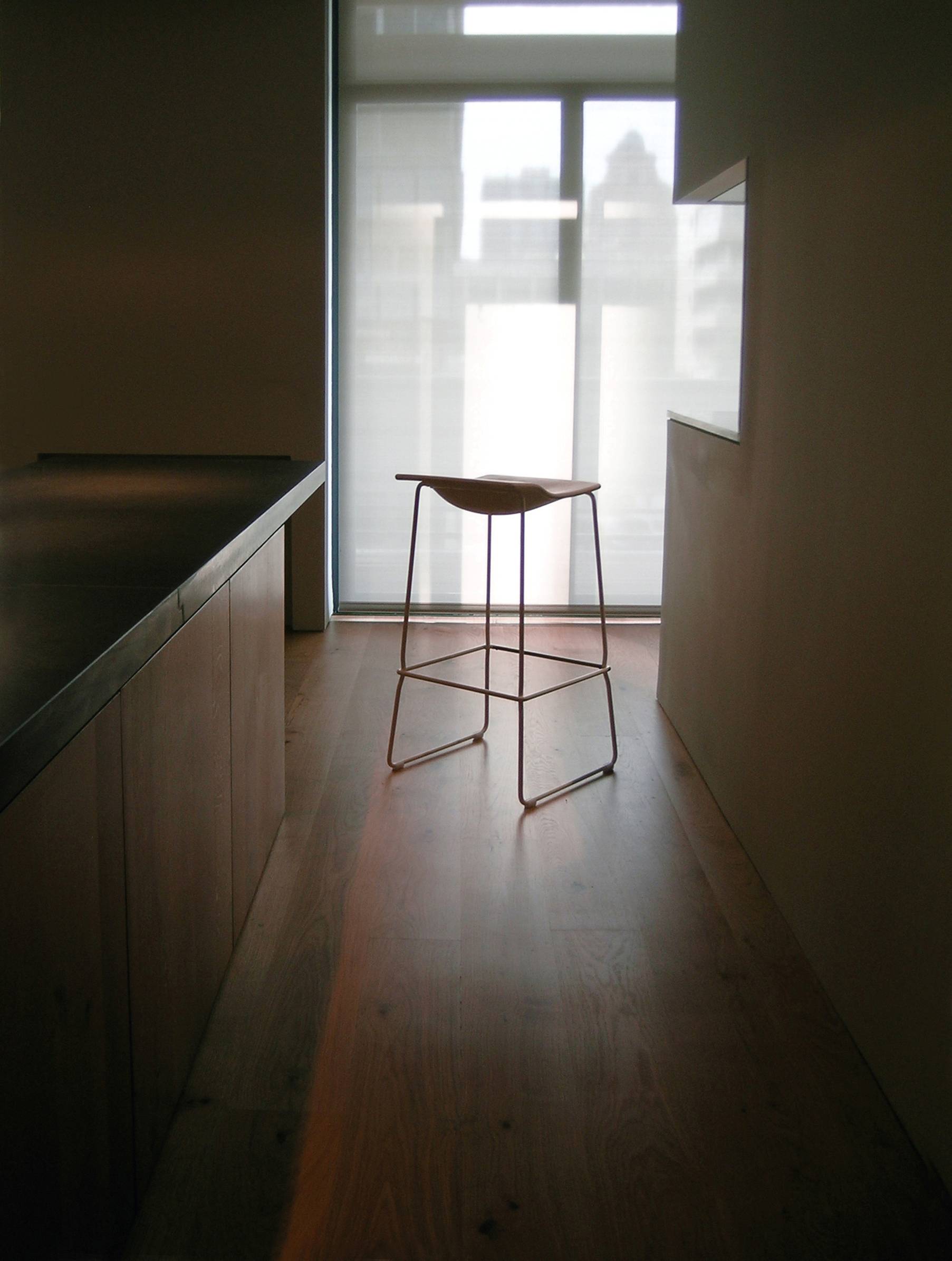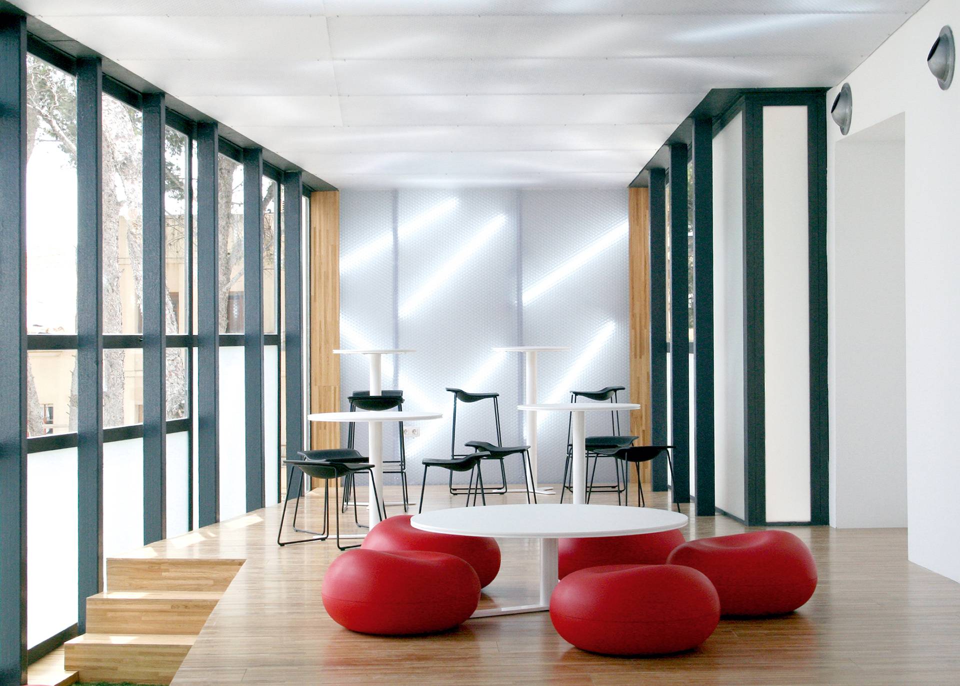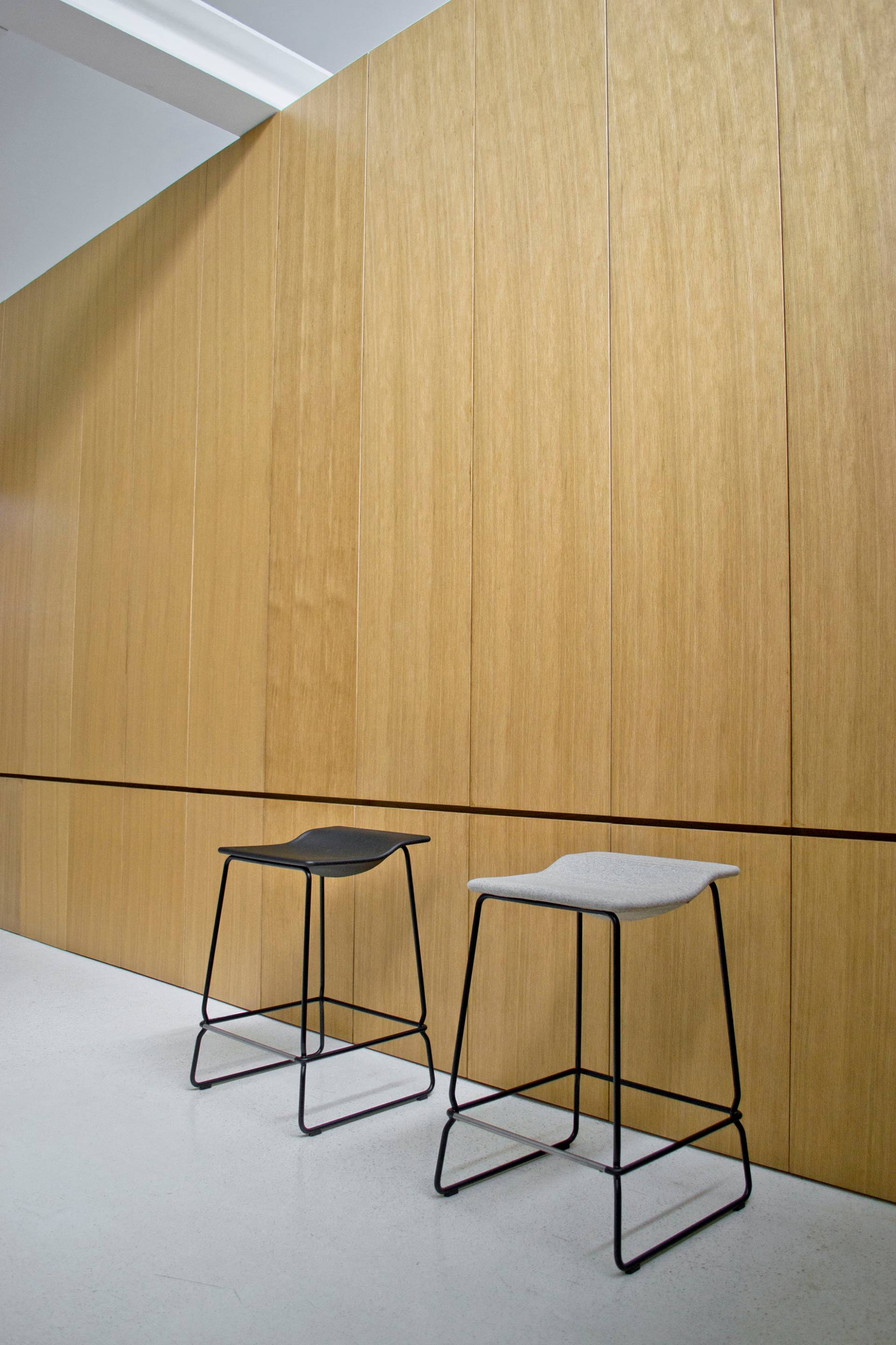 A rotomoulded polyethylene seat with lacquered steel frame and stainless steel footrest it is suitable for interior and exterior. Its structural design has become a contemporary classic. Now available the upholstered seat version.