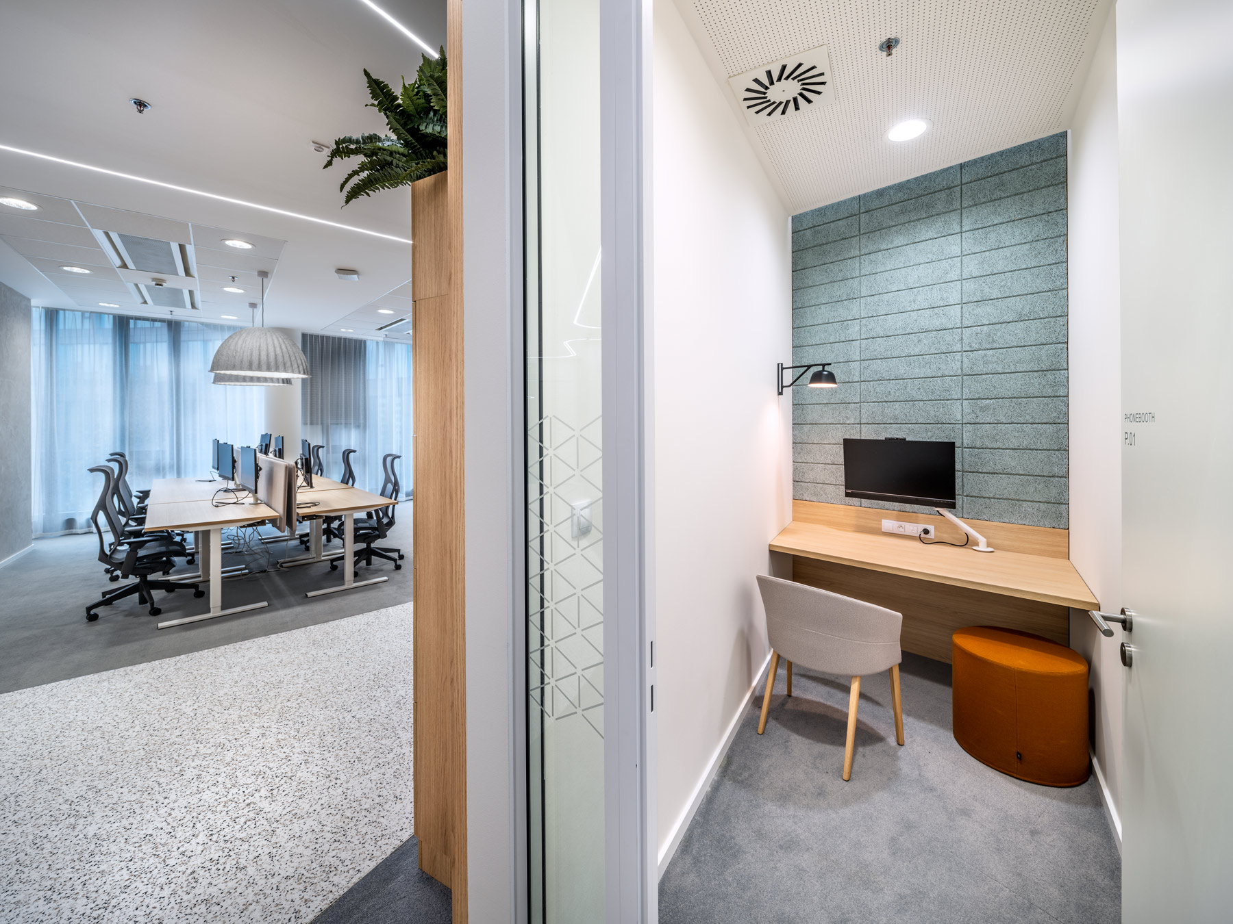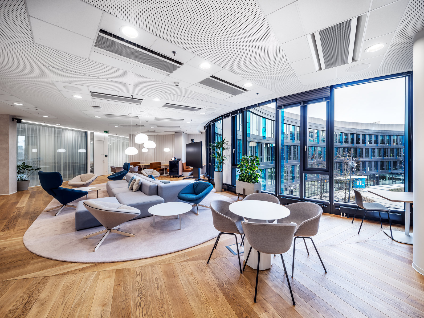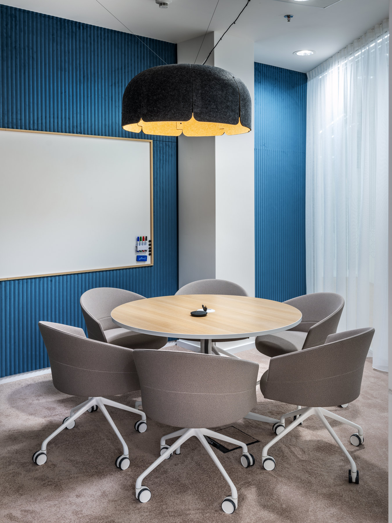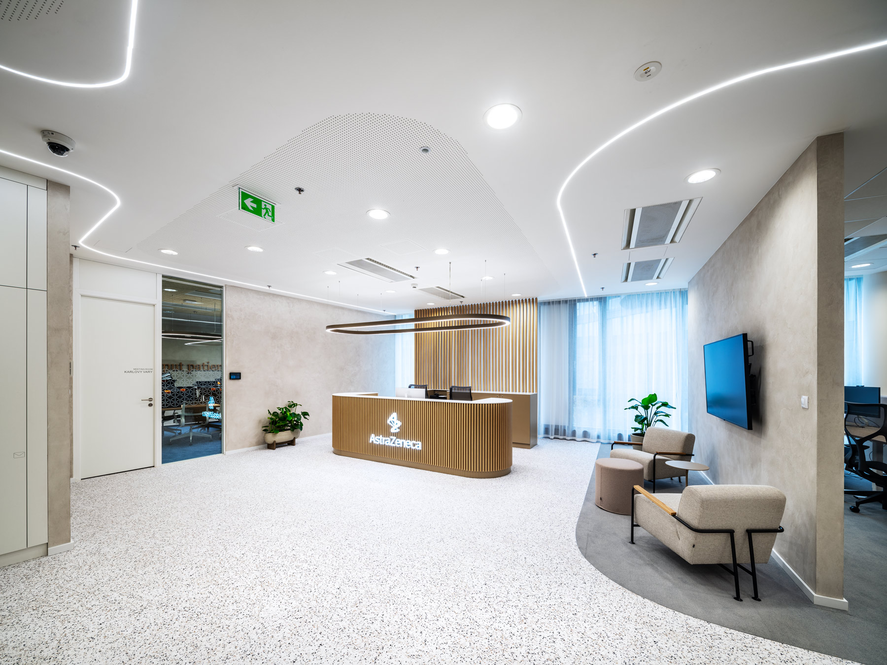 During AstraZeneca's move to new premises, we helped with furnishing the interior with furniture, but also with acoustic solutions for the space. We equipped more than 70 workplaces with height-adjustable cre8 FLEXI tables, ergonomic HermanMiller COSM chairs with automatic mechanics that do not need to be adjusted by personnel, so that workplaces can be shared without any problems. The meeting rooms are equipped with comfortable and innovative HermanMiller SETU ergonomic chairs. In addition to the classic cre8 PUZZLE and HermanMiller CIVIC meeting tables with cable management, we also supplied flexible Trilogy FARO folding tables, which allow you to quickly change the layout of the space. The acoustics of the space are helped to be solved by Framery acoustic booths with the best acoustic performance on the market and BuzziSpace brand products using the absorbing ability of the BuzziFelt material. The field of soft seating is represented by a wide range of products from the companies HAY, Enea, Sancal and Viccarbe. Lintex MOOD WALL glass and magnetic writable boards perform their practical function on some walls, giving the rooms a touch of exclusivity with their simple design.