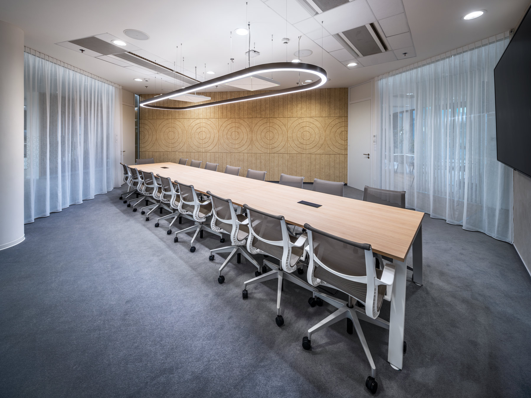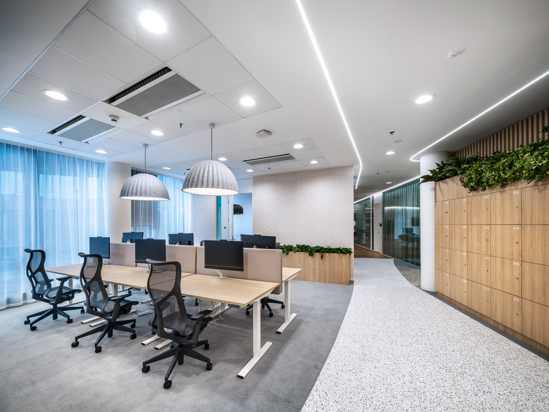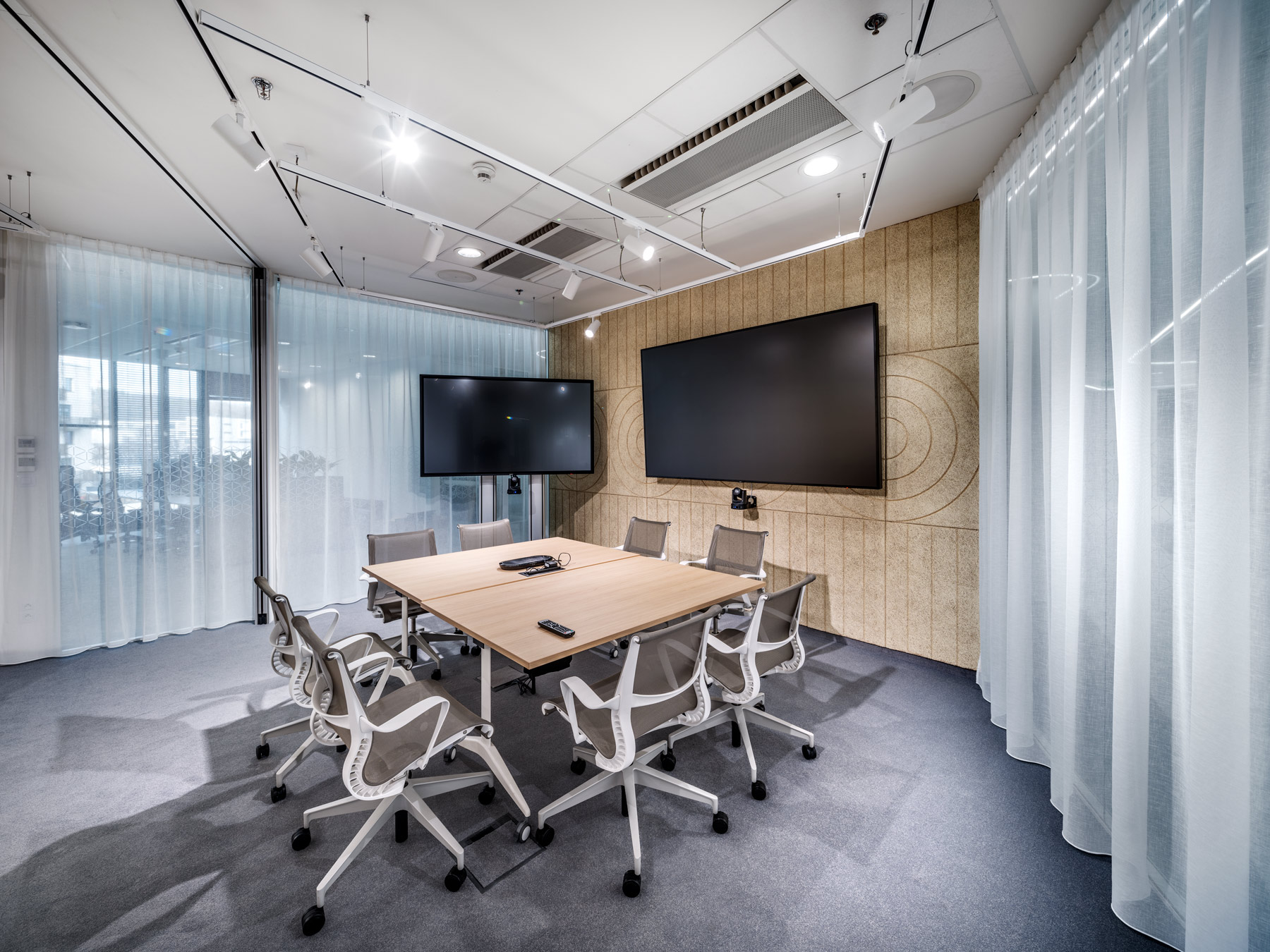 During AstraZeneca's move to new premises, we helped with furnishing the interior with furniture, but also with acoustic solutions for the space. We equipped more than 70 workplaces with height-adjustable cre8 FLEXI tables, ergonomic HermanMiller COSM chairs with automatic mechanics that do not need to be adjusted by personnel, so that workplaces can be shared without any problems. The meeting rooms are equipped with comfortable and innovative HermanMiller SETU ergonomic chairs. In addition to the classic cre8 PUZZLE and HermanMiller CIVIC meeting tables with cable management, we also supplied flexible Trilogy FARO folding tables, which allow you to quickly change the layout of the space. The acoustics of the space are helped to be solved by Framery acoustic booths with the best acoustic performance on the market and BuzziSpace brand products using the absorbing ability of the BuzziFelt material. The field of soft seating is represented by a wide range of products from the companies HAY, Enea, Sancal and Viccarbe. Lintex MOOD WALL glass and magnetic writable boards perform their practical function on some walls, giving the rooms a touch of exclusivity with their simple design.