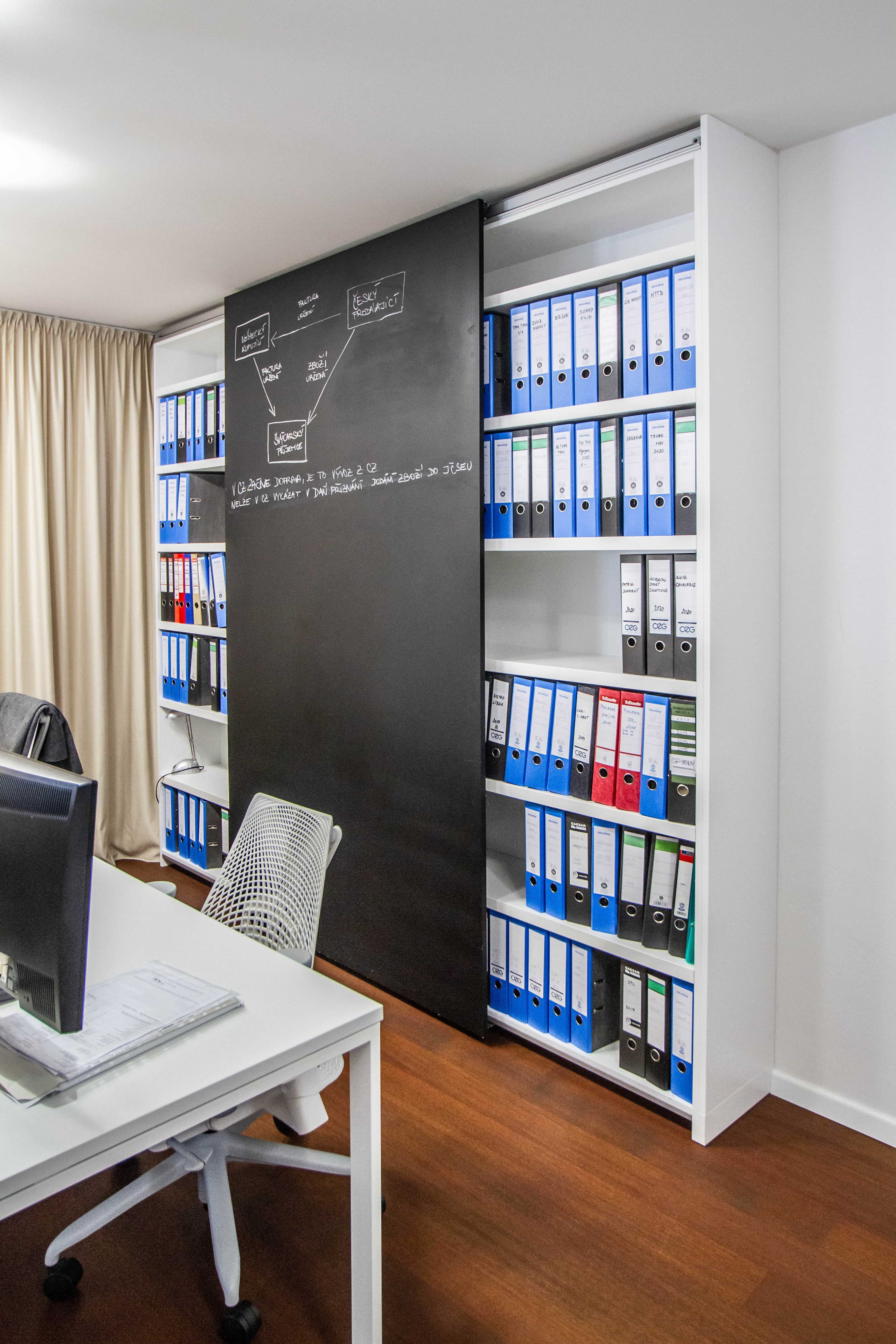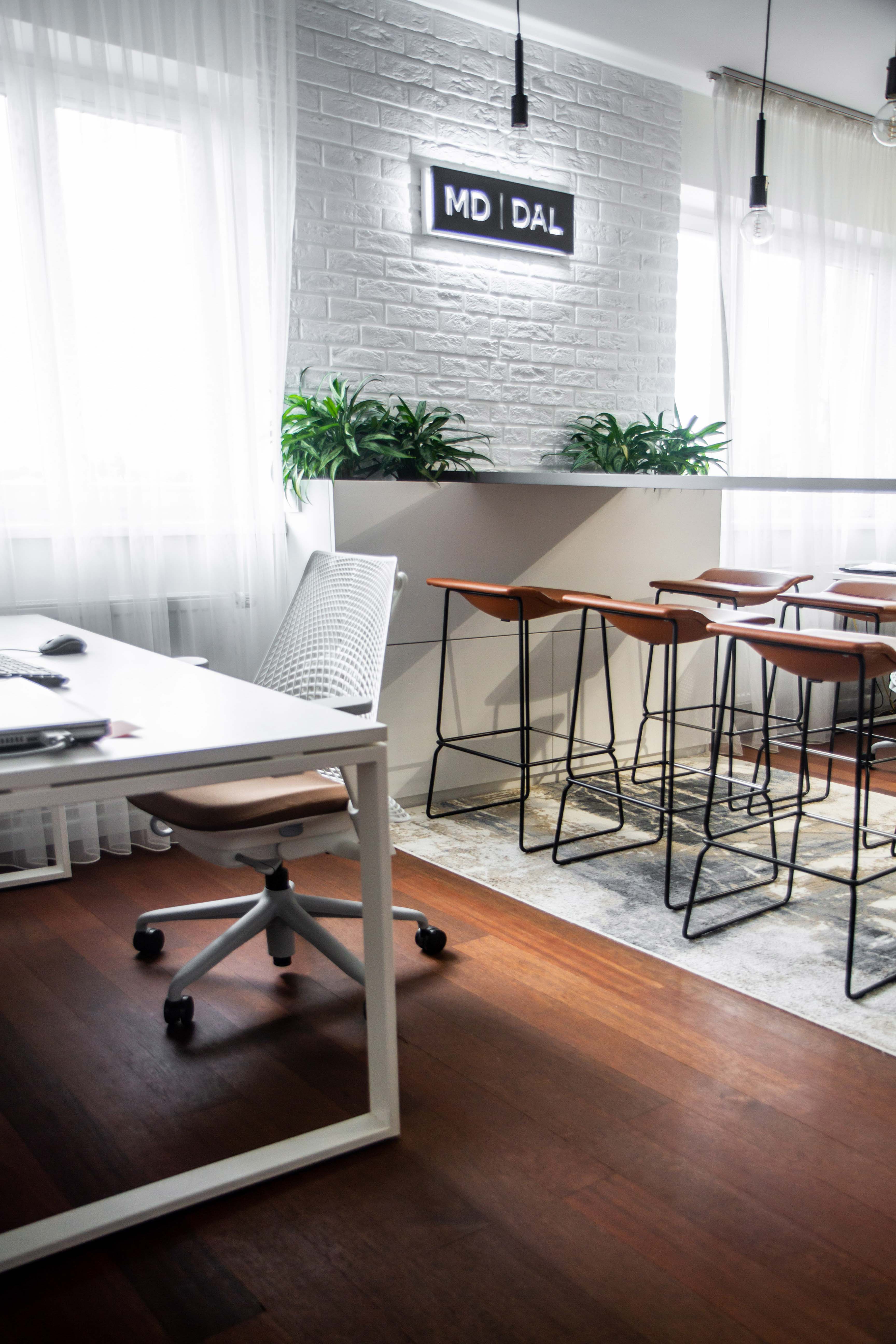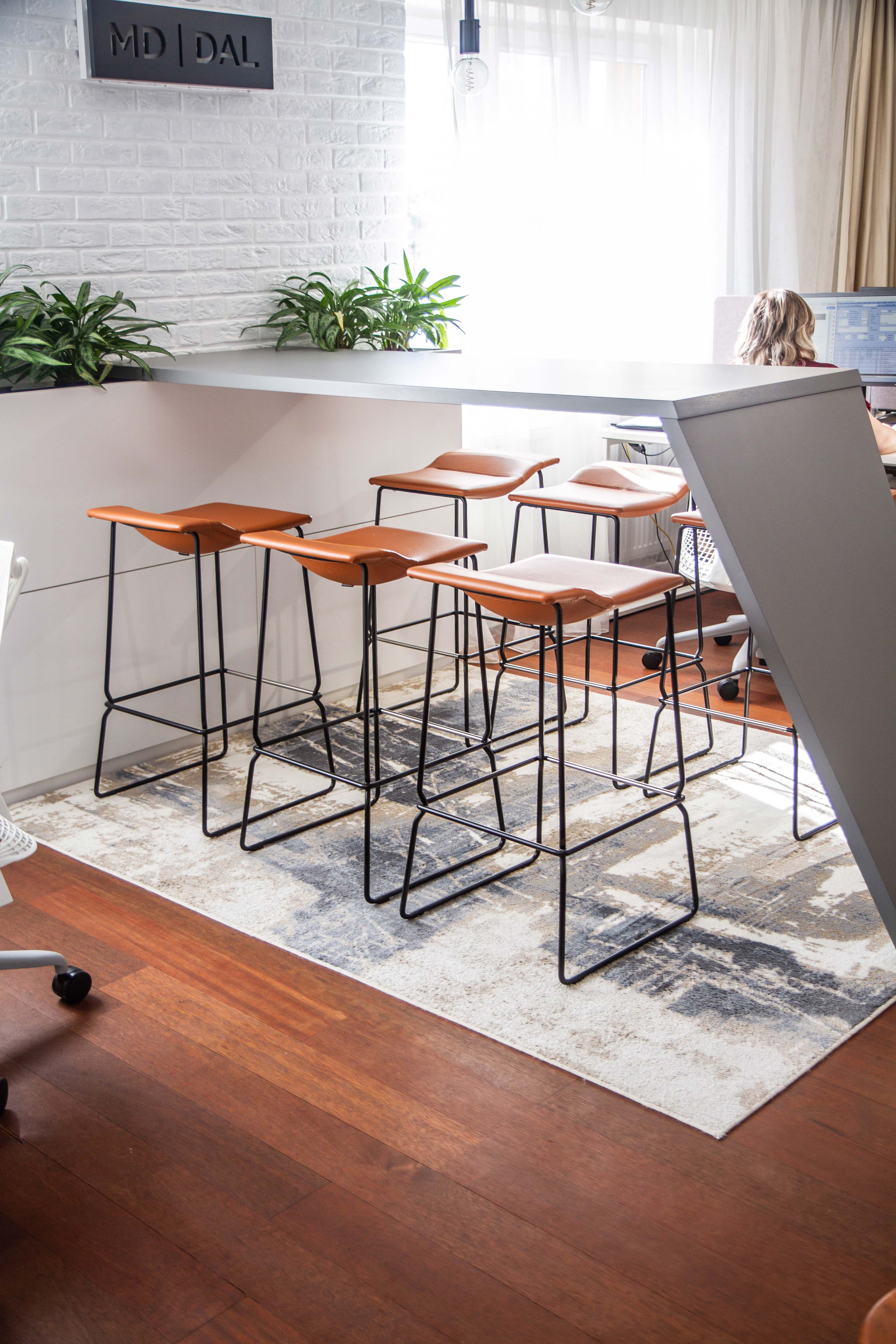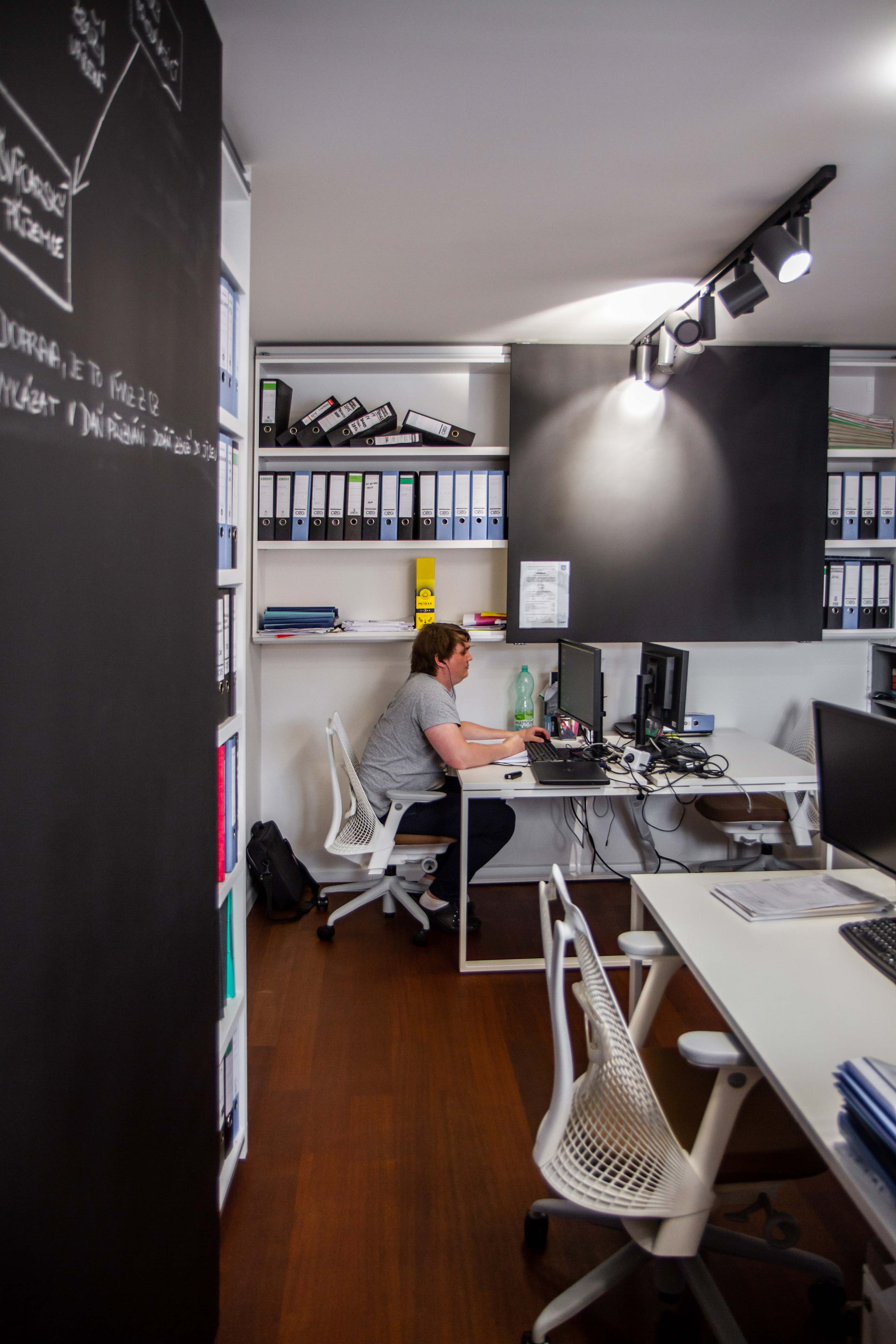 We have equipped industrially conceived offices for the accounting company Connect Economic Group. The interior has been designed in a way to hold as many working spots as possible and at the same time assure enough storage space, which is crucial for the accounting company. For example, Sayl chairs by Herman Miller were used, they are lightly built and their design does not look tough in a small office space. Another product used is leather bar stools Last Minute from Viccarbe, which complements the counter with a distinctive sloping base.